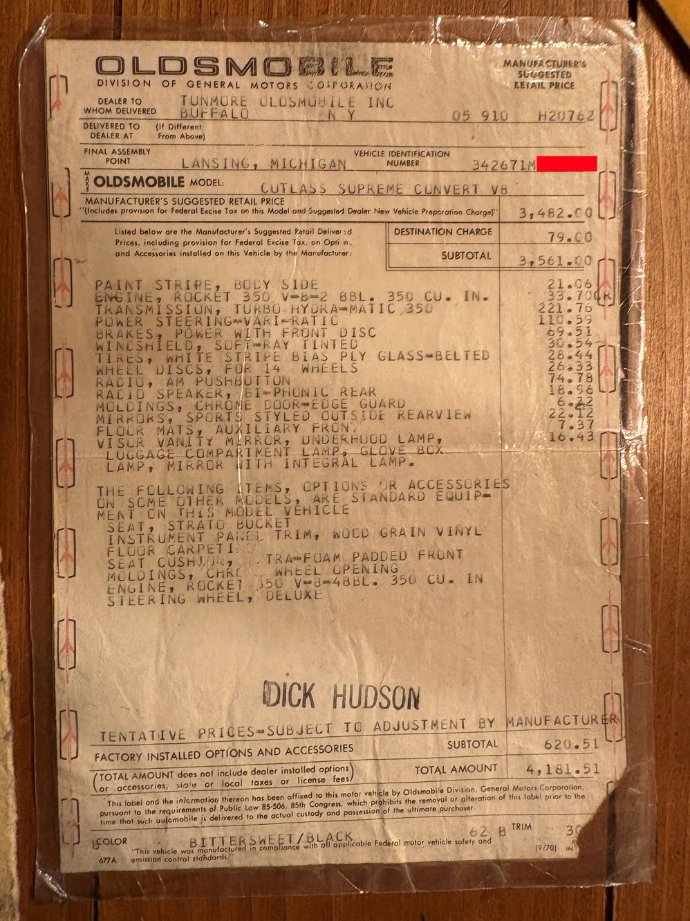 He has a 1971 Olds Cutlass Supreme Convertible that he has owned for at least 23 years after inheriting it from his late brother. He used to cruise this baby across the state to all the semi-local cruise nights and car shows over the years. My wife went up to NY State this week and took some photos. She also has the file folder on the car so I am waiting for her to bring that back since it may have original paperwork.