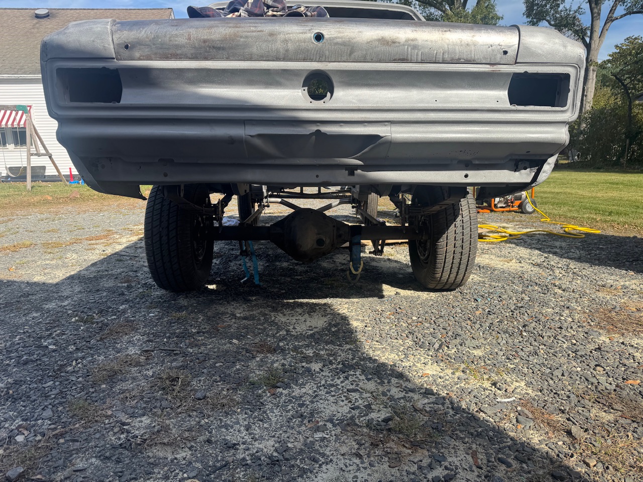 Hopefully I can get the engine mocked back into place for the winter. It’ll let me work on planning out all my pulleys and mounts so it can all fit. I’d also like to get around to pulling the front and rear axle out after I get the shock tabs welded on so I can get it all prepped, painted, and reinstalled so I won’t have to do it again. But being that it’s getting colder in NJ I’m sure it’s all going to take longer. The one picture is just the back end of the car because I thought it looked cool with the Dana 60 hanging there. I also worked the roof a bit to get it straighter from the damage done during blasting. My dad actually came up with the genius idea to put a vinyl roof on it. And to fit the period/look I’m going to call around next week and see if any Mod Top reproduction material is still around/being made. I’d love to use the 69 Dart/Coronet green. But will see what’s still on the market and go from there. Thanks for reading and God Bless