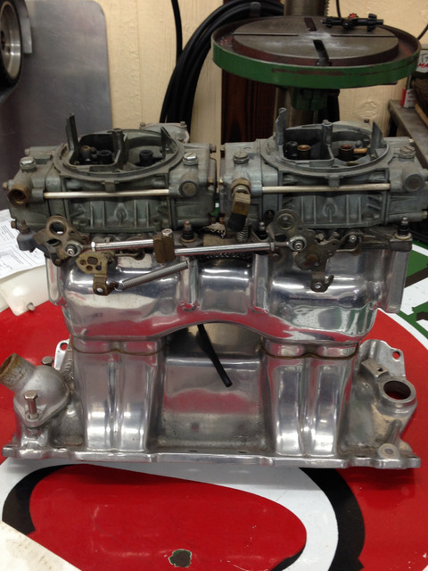 Polished, Edelbrock TR1X with 600 Holley carbs. This was bought to be installed on the red Vega wagon that I have posted pictures of, but have decided to go with another intake. Buyer should keep in mind that carbs may have to be gone through, as it was never installed. They may be fine as is, but I do not know.