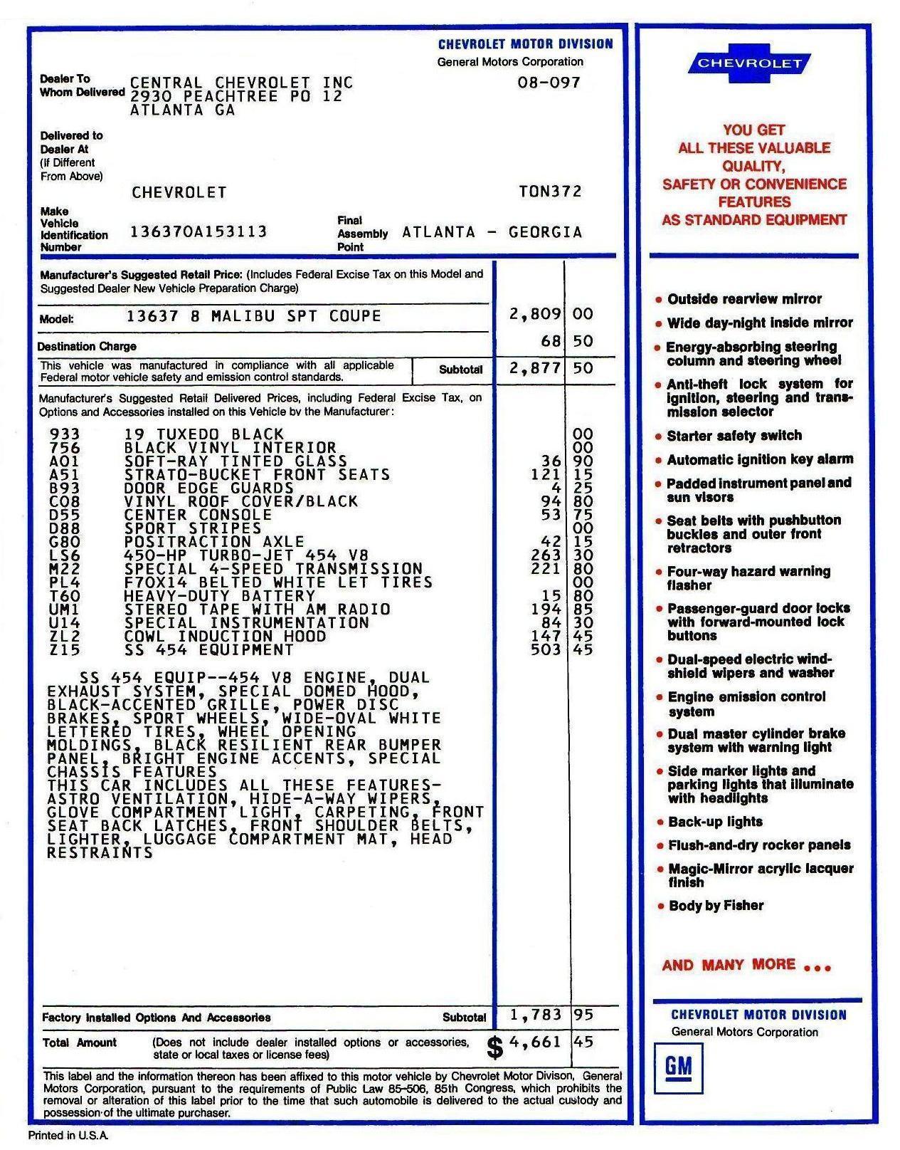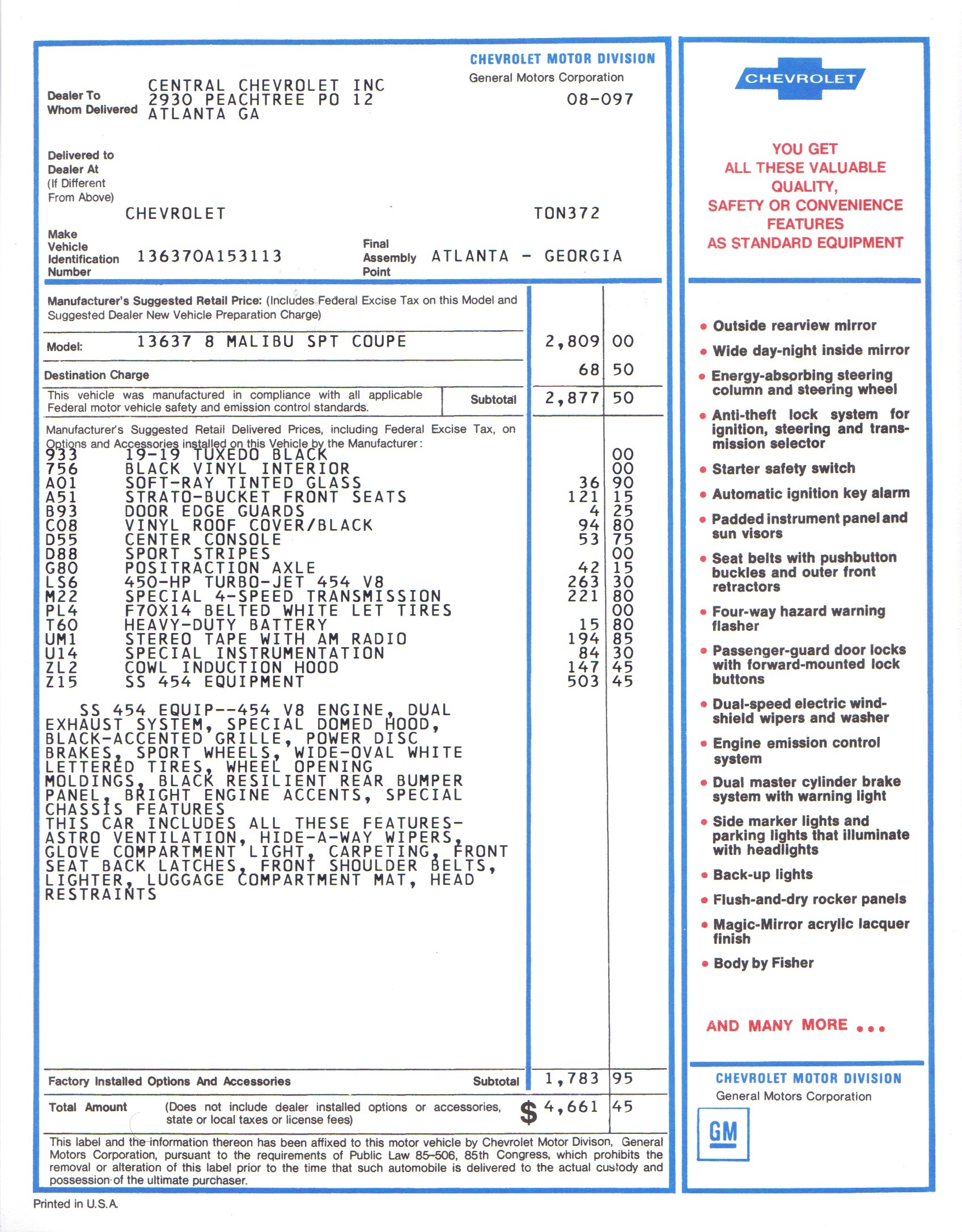 The bottom line is I tell people my Window Sticker is a re print but on the other hand it attracts people to understand what my car was born with by looking at that Window Sticker. My car has the real deal build sheet but I also put a reprint of that on the dash as God forbid I have my real one for some idiot to steal if I chose to display the real Build Sheet. I really don't think it is a problem for display purposes to show a Repro Window Sticker but when a owner or seller lies about his documents that is were the big problem is but in the end a new owner has to do his homework before buying a car with any kind of documents.