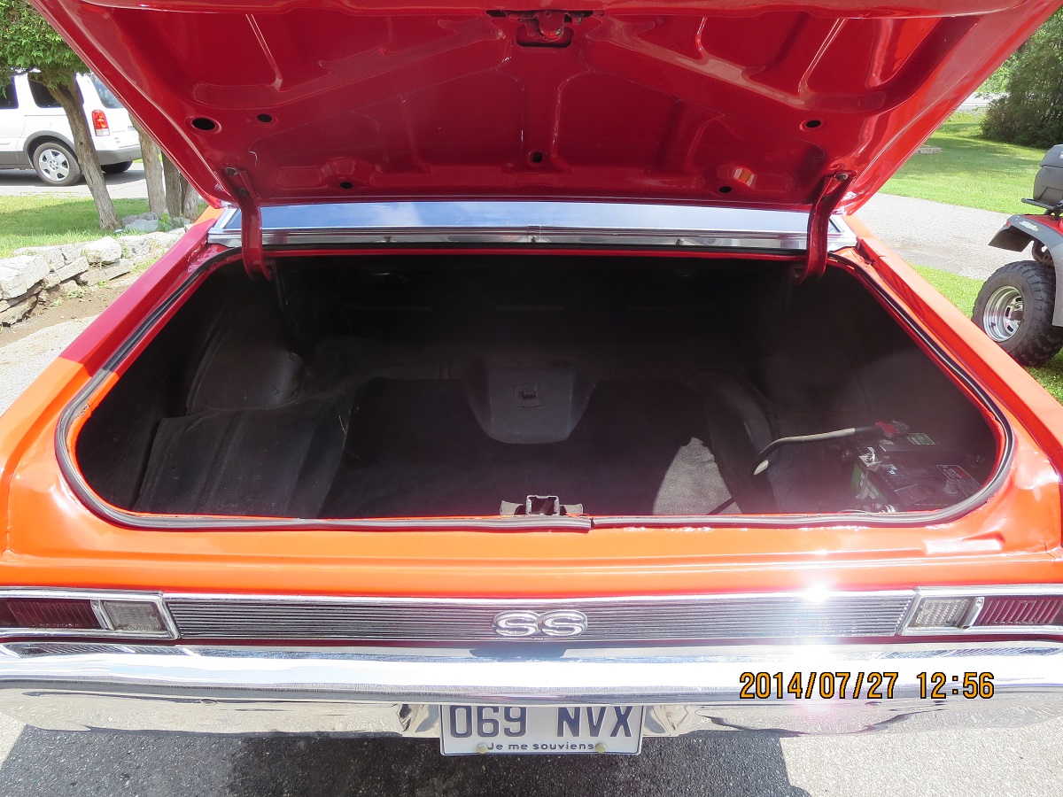 THE CAR HAS A SMALL BLOCK CORE SUPPORT, HARD TO FIND IF YOUR TRYING TO MAKE A BB. NO SS BADGING AND NO BB HEATER BOX, VIN SHOULD READ 11427. WONDER IF IT HAS DUAL EXHAUST HANGERS? looks like a small block radiator. WAs wondering if it is a true ss and how is the trunk ,floors under carriage for rust? Where it the car located? Im in illinois... bob