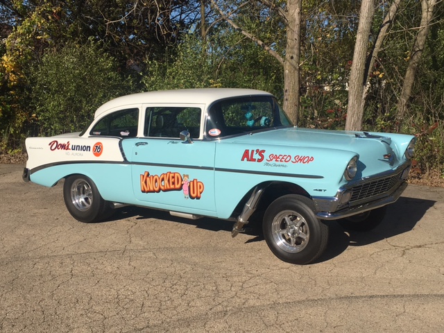 John is in the Nash taking a nap while Randy is at work, installing a NicKey Gasser frame on a '56 Chevy.