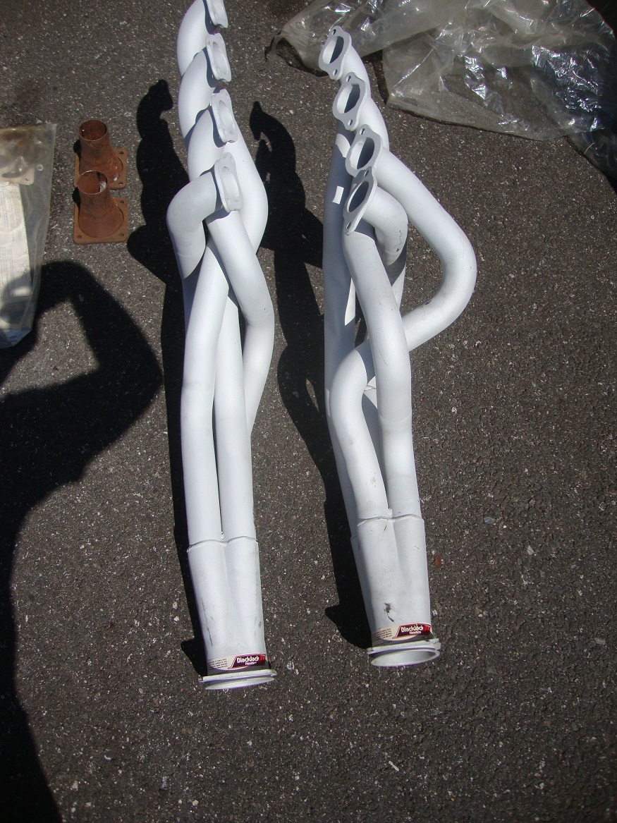 Purchased new many moons ago and never used. White coated from the factory. Blackjack big tube Chevelle headers. Square collectors. Perfect shape. Includes mounting hardware, Mr. Gasket gaskets and square collector adapters. $600 pair. No shipping but can deliver to Charlotte, Carlisle, etc etc.