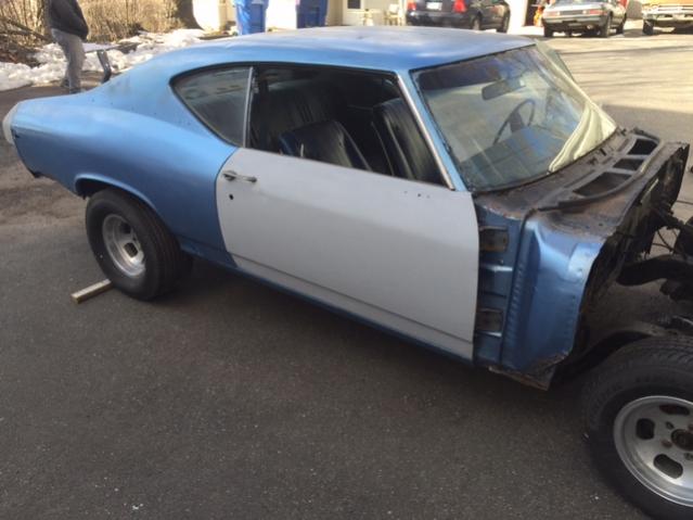 1969 Chevelle SS 396 in very rare Glacier Blue with dark blue vinyl top and dark blue buckets & console. The car is a L-78 with M21 4 speed and 3:73 posi rear. The car has a original partial build sheet that lists engine, trans and rear option codes as well as colors and body number. It will need total restoration including quarters, outer wheel houses and trunk floor, the floor is in decent shape but needs a few repairs. The roof is not damaged from the vinyl top and the window channels,rear deck filler panel, inner and outer rockers, cowl, cowl sides, firewall and dash are in great shape. This is a beautiful and rare combination when done!$16000 obo.
