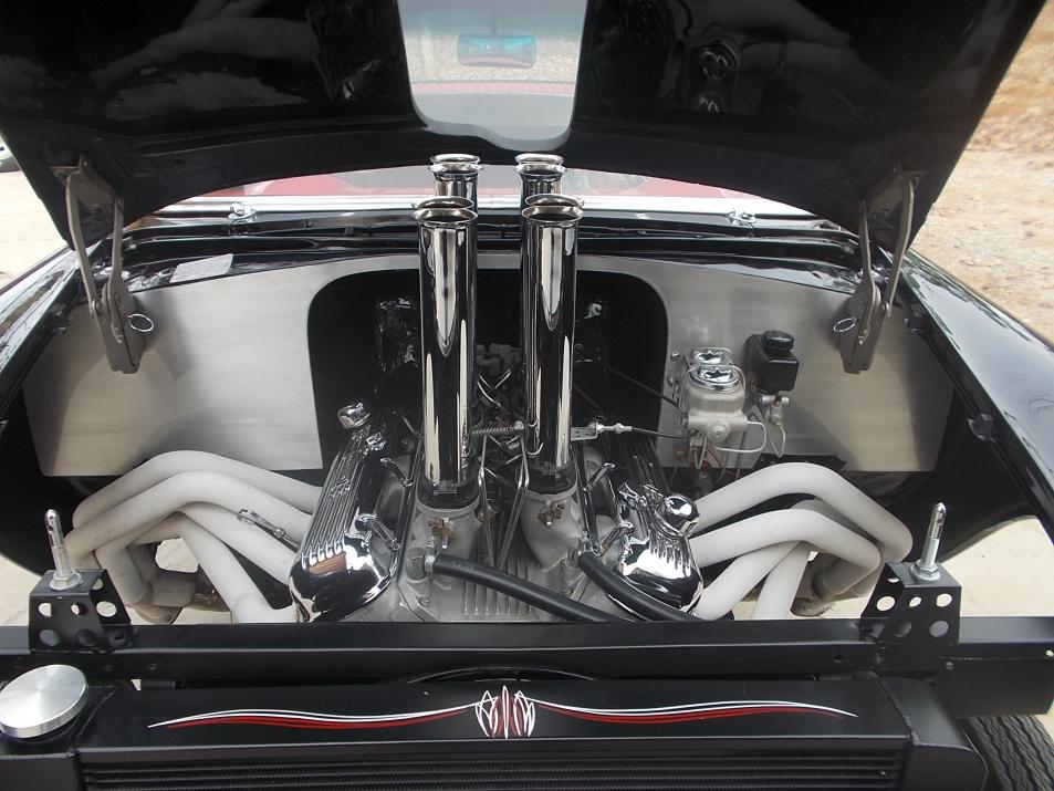 All steel 210 post. Full solid roller 427. Brodix BB1 Aluminum heads. Original Hilborn Injection that has been converted to electronic with a FAST management system. 48 lb injectors located in the original locations with individual stainless lines run to each injector. No modern fuel rail! All sensors and wiring are very well hidden. Starts easy. Idles good. Has a lot of cam and a gear drive, sounds wicked. White ceramic coated fenderwell headers. Custom built radiator. Does not get hot. Very friendly to drive. Aluminum flywheel, Tremec TKO600 5 speed. 1957 Pontiac rear with 4:88s and a spool. Trans has a .64 overdrive so with 31" tall cheater slicks it turns about 2400 rpm at 70 mph. 4 point roll bar. Custom interior with Chevy van front seats. Very comfortable to drive.