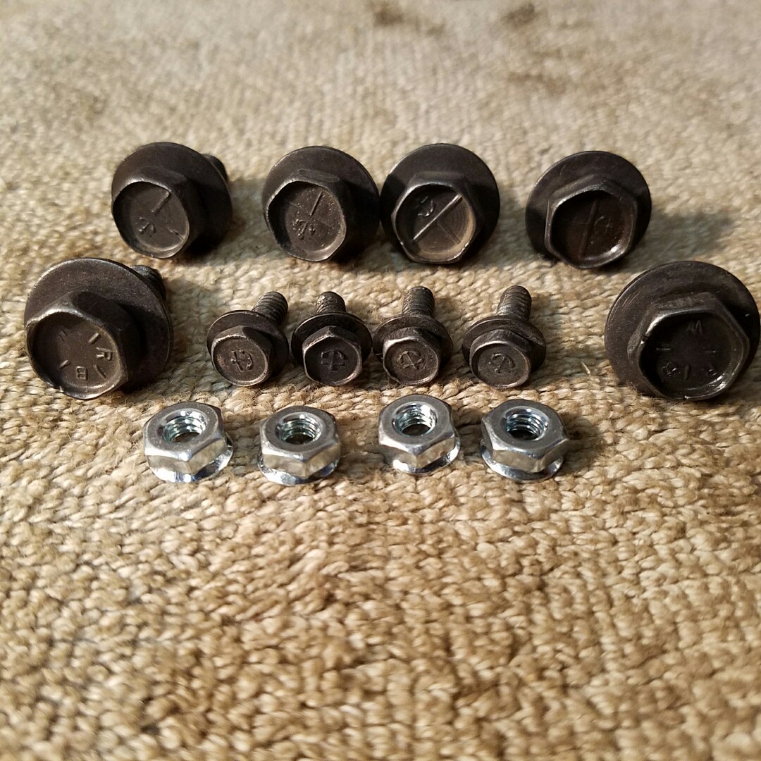 Extremely nice set of original 67 - 69 Camaro front spoiler mounting hardware. The for small 10-24 bolts have an anchor head marking the four flat tip 5-16 bolts have an anchor over T head marking and the two 5-16 pointed tip bolts have rbw head marking.