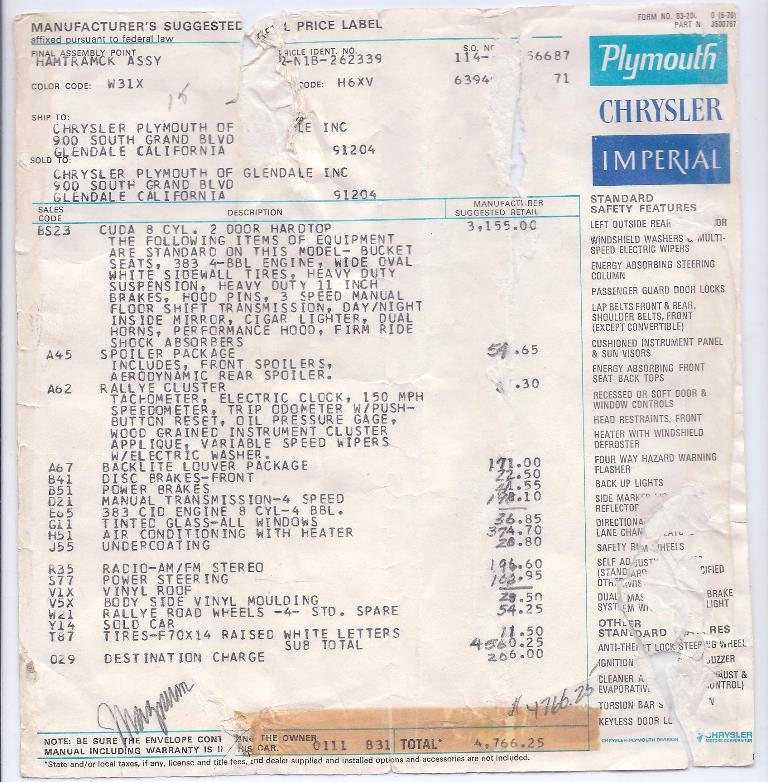 Still for sale. This is a really rare 1971 Cuda' 383 magnum 4 speed. It is a Special ordered California car. It is ultra rare down to the options and colors. You will not find another one like this. This car is not restored. It had one repaint back in 1989. Engine was freshened up with about 600 miles since. 3 owner previously owned car. It was special ordered from Glendale Chrysler Plymouth in Glendale, California. Car has $1500. in options. This car retains the original exhaust system dated August, Sept. 1970. Car was built January 14th 1971. Owner picked it up on January 26th. 1971. This car is highly optioned. Cuda' 383 4 speed. One of only 501 383 4 speeds produced in 1971. Add to it factory A/C which is really rare. Then come the other rare options. EW1 Spinnaker White exterior with the VX code interior. Only a handful of Cuda's were built with the Orange Vinyl seat covers with black seat backings and the rest of the interior is Black also. Super rare interior. Black vinyl top. Rare factory rear back window louvers. These are a real rare option usually guys add to their Cuda' but this car was ordered with them. This car was ordered with front and rear spoilers. Hood Pins. Tinted glass. Rally Woodgrain dash full gauges and tachometer/clock. AM FM stereo. Power steering and power disc brakes. This car has not been restored. A lot of the interior is original. The Car has not been taken all apart and put back together. The vinyl top is original also. This car is fully documented. This is a Two fender tag optioned car. The car comes with the original window sticker. The original build sheet. The original stopping distance sheet with the cars vin. The original owners name on the warranty sheet. Just put a new clutch and pressure plate. 3.23 open rear end. No posi for a California car ordered with A/C. This is one of the rarest optioned 383 4 speed Cuda's. Runs awesome. All gauges work. This car is full matching numbers engine and transmission. This car has a lot of the original assy line markings on the trans and rear end. No rust what so ever. The car still has the original Blue and gold plates. I have a lot of the license plate registrations. This is a great car to invest in. Car is in Lower Michigan now. I added the 15 x 7 Steel wheels and new Goodyear Polyglas F-60-15 Raised white letters. Came with 14" Rally's. Absolutely a stunning Cuda'0 $85,000 obo.