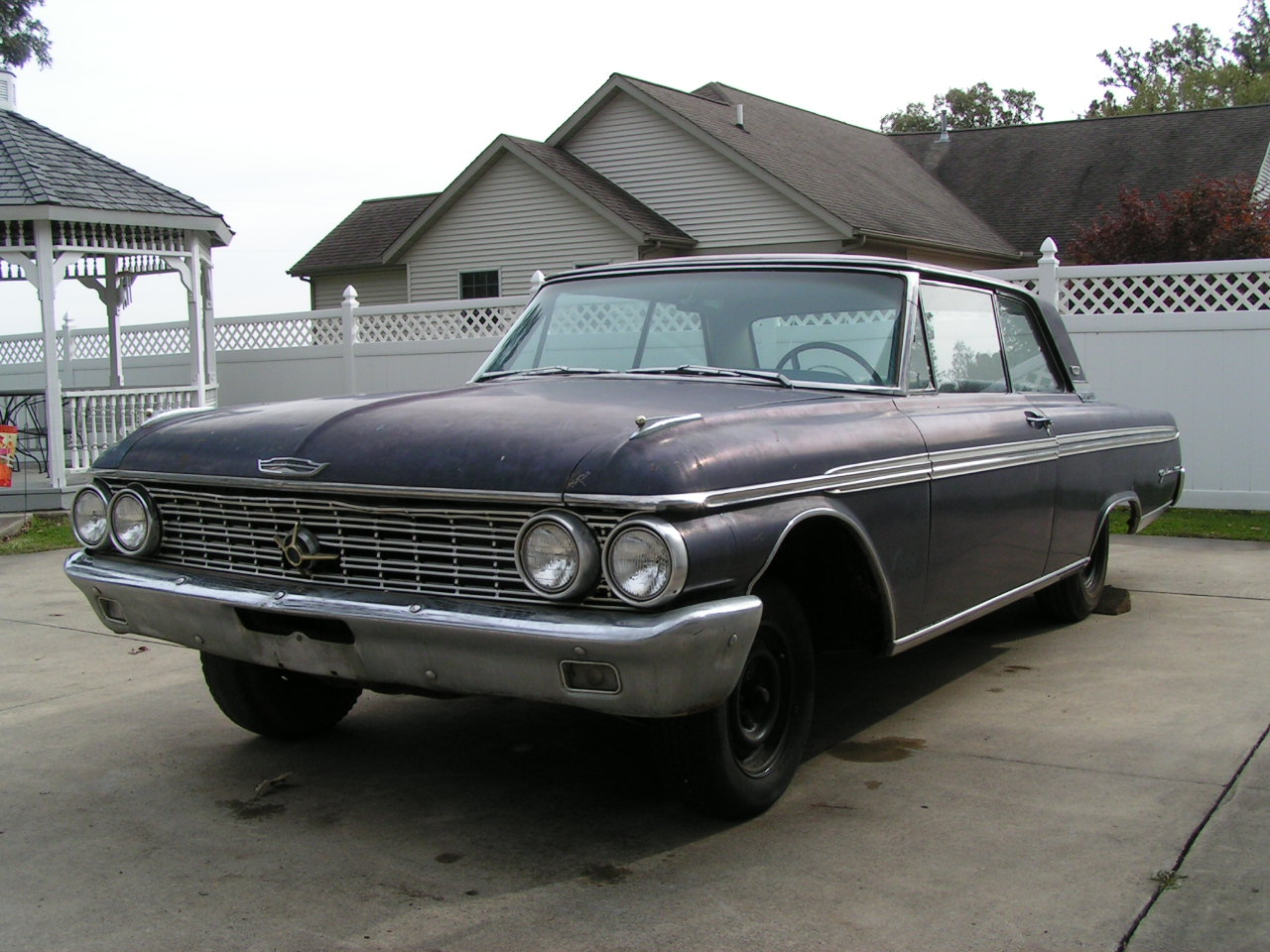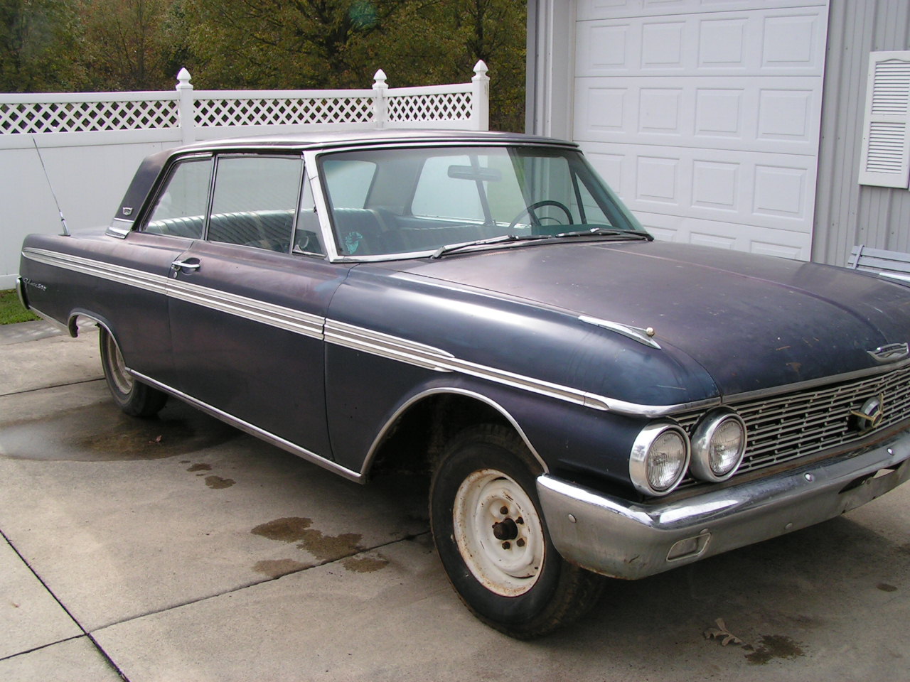 !962 G code Ford Galaxie, G code cars were 406 tri-power with 405hp. I bought this car at an estate sale, motor and trans is gone but the son of the deceased says he has the motor and trans. The car only has 35,964 miles, current title is dated 1967. I have looked this car over top to bottom and there is absolutely no rust. The car originally was a 3 speed with overdrive. All the chrome parts need redone but all the stainless is outstanding. The grill is trash. Paint is original but shot. It will need a full resto but what a solid platform on a rare old Ford. $10,000 or might trade.