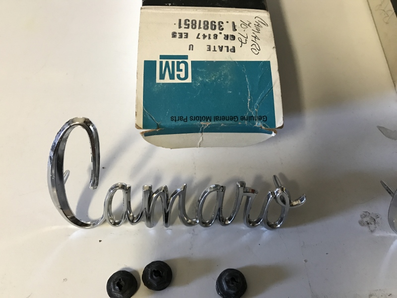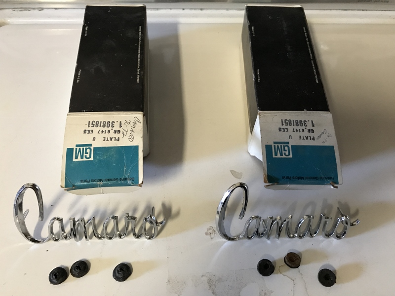 SOLD Hi Everyone, I have two NOS 1970 Camaro - maybe up to 1972 including 1971 - fender emblems part number on old GM boxes is 3981851 includes the correct cut nuts with the dumdum intact, never used of course. Nice, real GM pieces these. $100 shipped to paid members in the US. Thanks all, Anthony Last edited by AnthonyS; 05-02-2020 at 07:58 PM. Reason: sold |