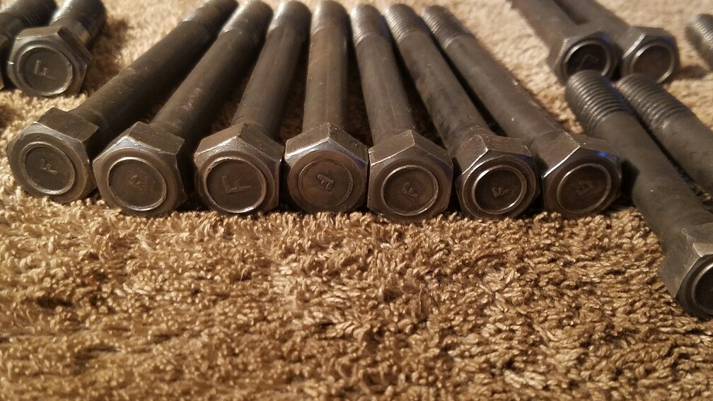 Over 100 sets of original assembly line installed head bolts. First starting out with small block. First-set double-o head marking. These are originals not reproductions excellent condition. 14 long, 4 medium and 8 short. $80 plus $6 to ship to the lower 48 if paid with PayPal friends and family. I have 30 sets of O head marking head bolts.