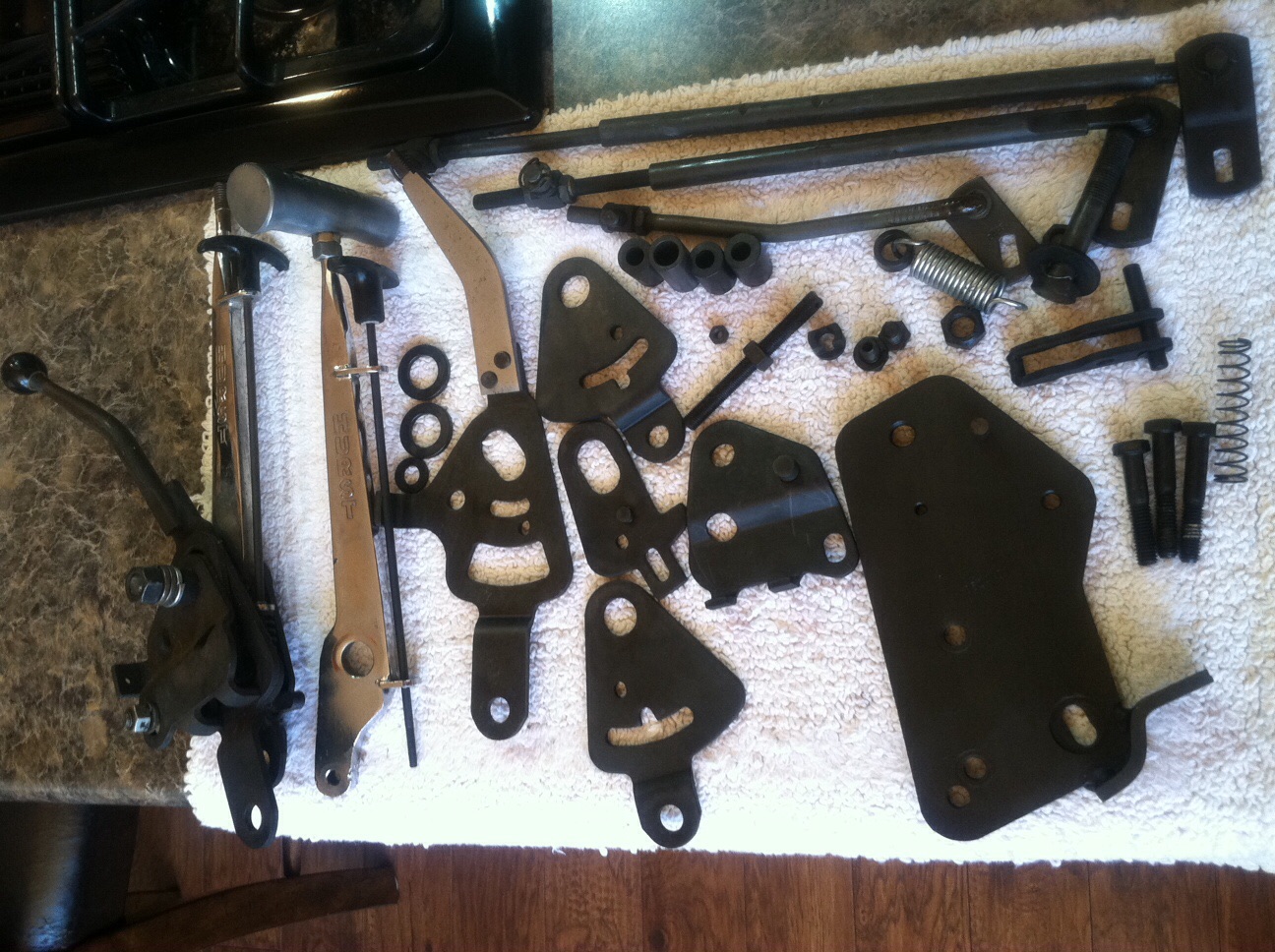 I was told, the flat reverse lever, mounting brackets and rods fit Chevy....