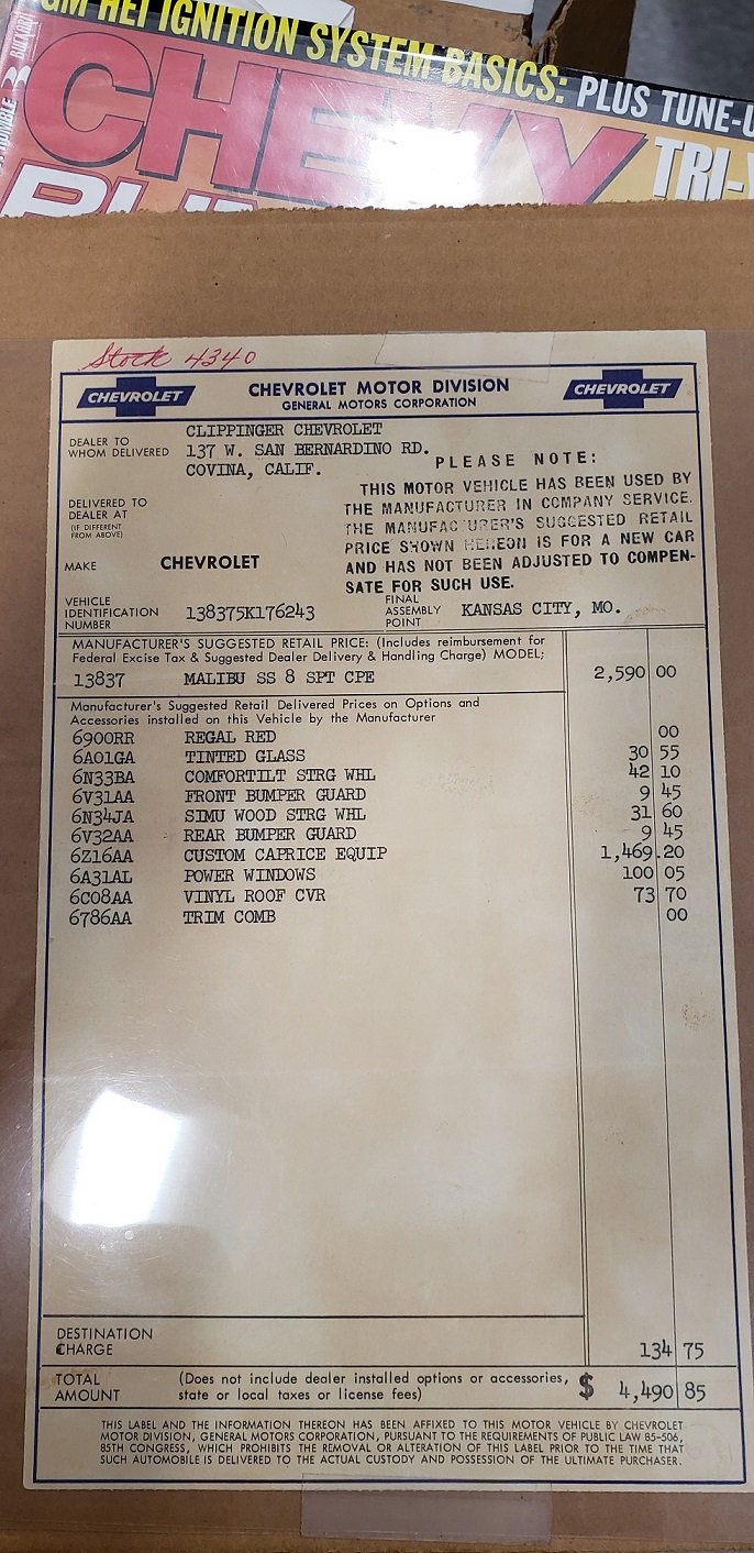 See attached original 1966 Caprice Brass Hat Car with typing and stamp on original window sticker. Paul Winvoices