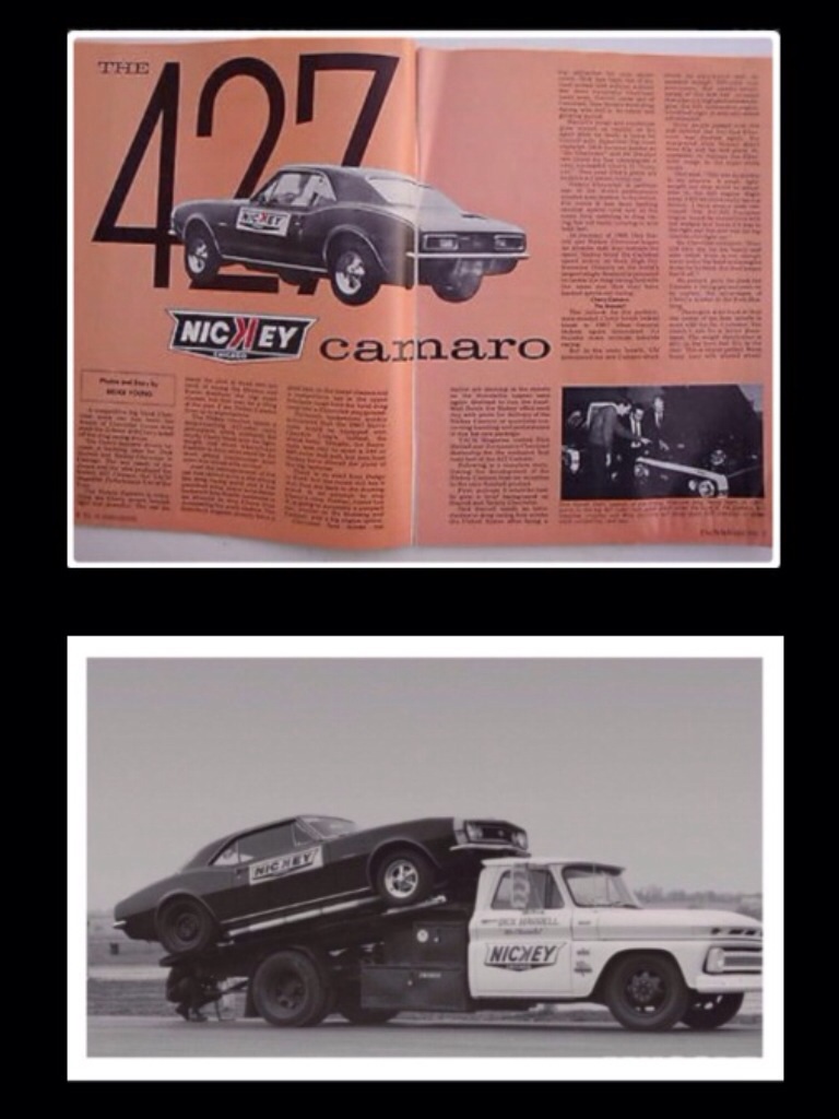 I think Dana and Nickey/Bill Thomas were both working on 427 Camaro conversions as soon as possible and did them about at the same time. Bill Thomas was a race car fabricator who did some work for Chevy and was well connected with Chevy Engineering The hard part of the early 427 Camaro conversion was the headers. The factory BB was offset forward and to the pass side to fit in the Camaro and had an offset cross member and heater box and other parts. The SS350 to 427 Camaro conversion used the SB parts. It worked but needed headers as the exhaust manifold would hit the steering box Bill T was making the early Camaro headers and traction bars and other parts Dana had an early 427 Camaro drag car attached a pic of a Yenko/Dana ad from late 1966 and an early Dana/Nickey article |