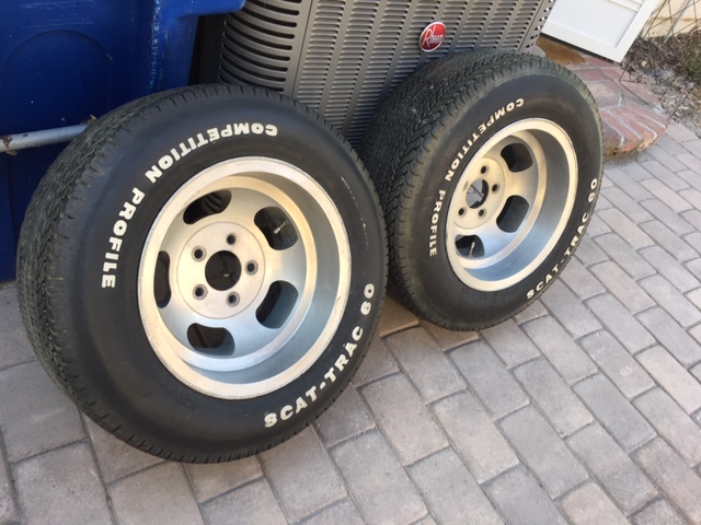 Pair of Ansen sprints 15 x 8.5 with a chevy bolt pattern. Nice used condition with G60-15 vintage scat-tracs. Might separate wheels from the tires, would prefer not to ship, and I know that takes a lot of you out of the conversation, but I'm in San Diego and could meet someone halfway? Looking for $349 for everything. One tire seems to hold air, the other isn't, not sure why.