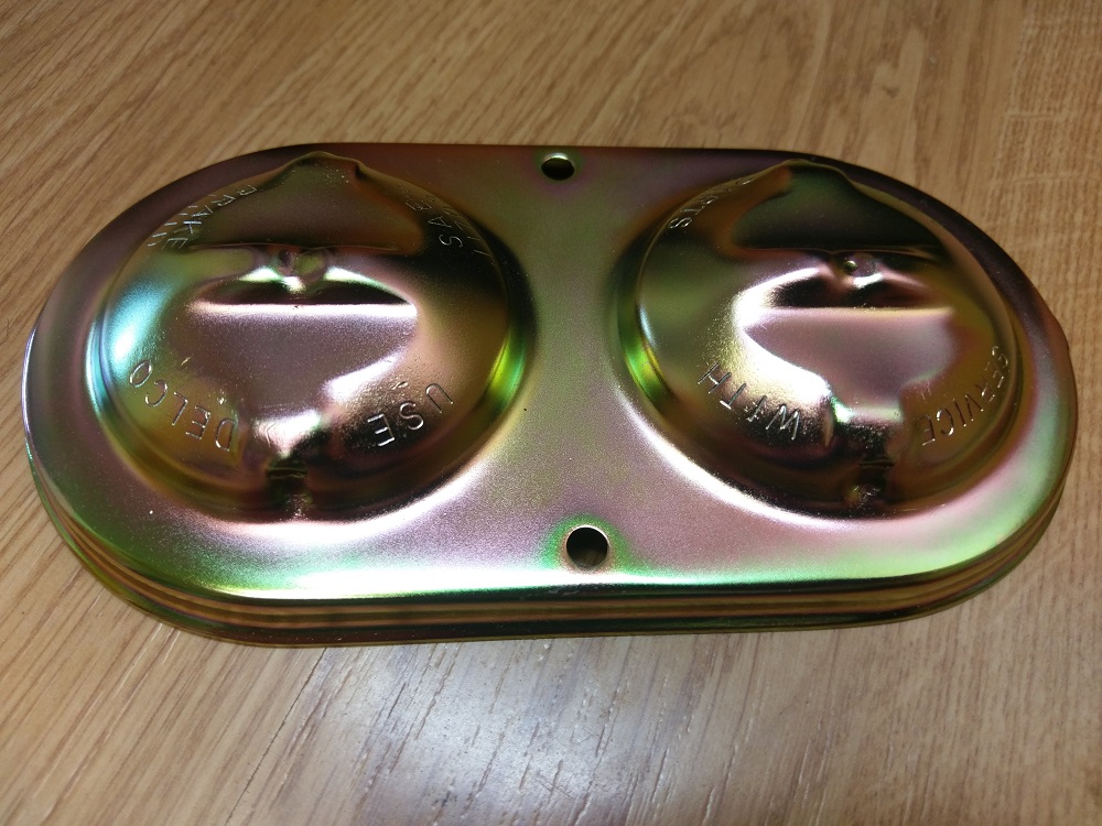 Selling this beautiful OEM GM master cylinder lid for the 69 Bendix oval dual bale master cylinder. This has the correct wording on it for that year, including "SERVICE WITH DELCO PARTS" and "USE DELCO SAE J1703 BRAKE FLUID." This was a Western piece that survived exceptionally well. I sent it to Steve Gregori and had it replated. You will be hard-pressed to find a nicer one. There aren't even screwdriver marks in it. SOLD