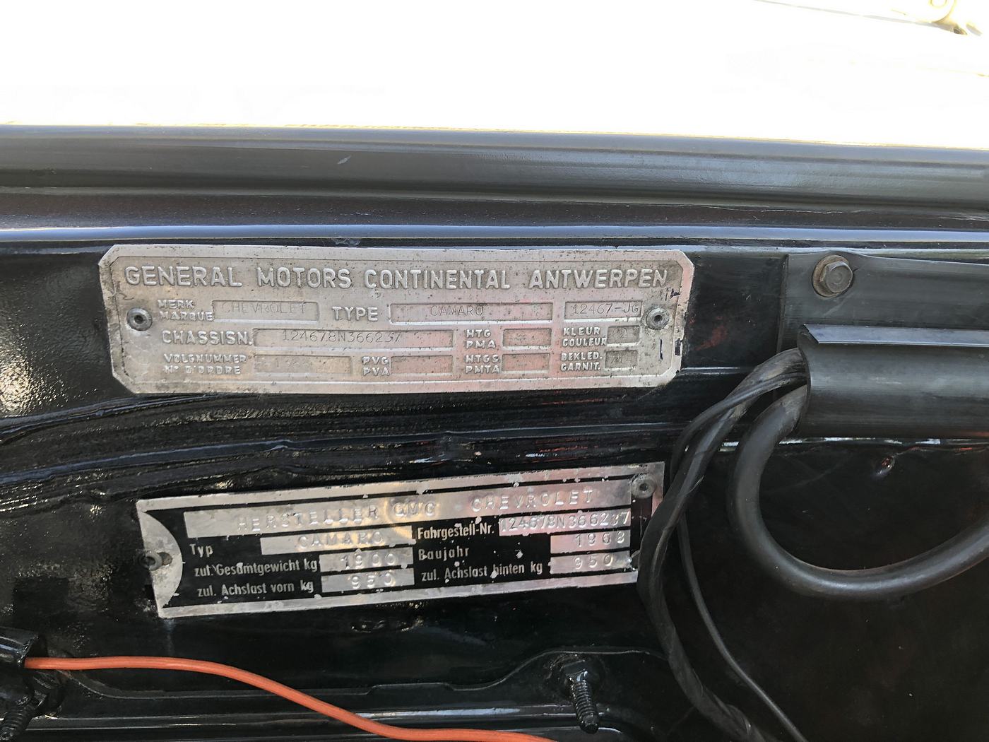 1968 Camaro Convertible European export. The car was exported to Belgium, and was modified to meet local requirements and sold in Germany. The car was built by the Norwood factory. It has the GM Continental Antwerpen firewall tag and the German homologation tag. The car made it back to the Phoenix Metropolitan area between September 30, 1999 (the day the German license plates expired) and August 24, 2000 when the car was first registered in Arizona. It's a numbers matching L30 275HP 327 with a power glide. Deluxe interior, power brakes, power steering, power convertible top, rear window defroster, fold down back seat, center console with gauge package. All gauges work, with the exception of the clock. Five original XF 14x6 steel wheels. NCRS Shipping Data Report that shows the car was a GM export. $39,500 - Greg at [email protected] or (303) 917-6341 cell.