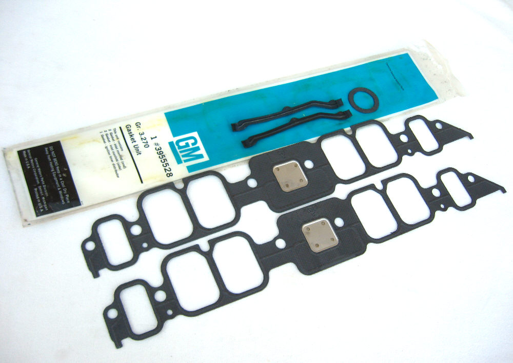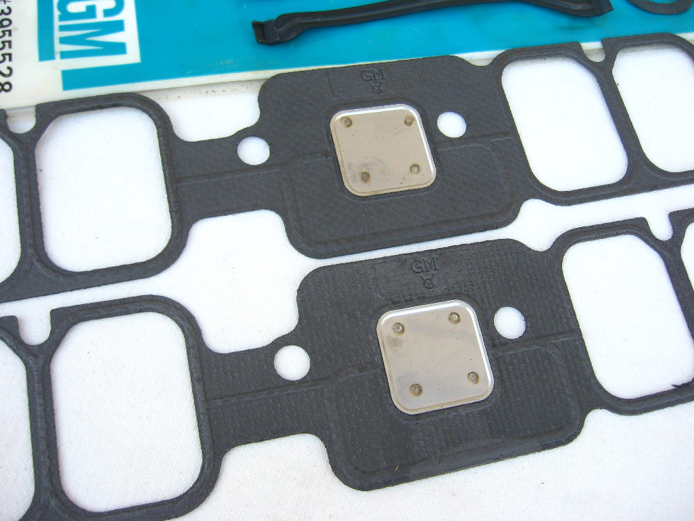 NOS GM ZL-1 427 engine intake gasket set. These have the metal block plate for the heat riser. Could also be used on the L-88 and L-89 engines. Includes the side seals as well.