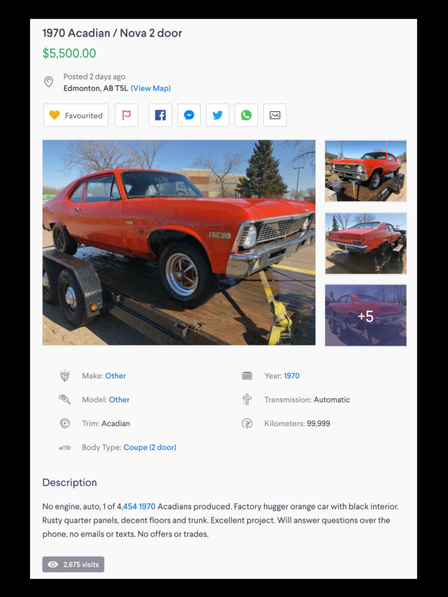 On Kijiji Edmonton, could be a 6-Cyl. car originally but Factory Orange may make this '70 Acadian Coupe worth doing? ![]() https://www.kijiji.ca/v-view-details...teLocale=en_CA $ 5500 Cdn. isn't much more than 4-thou US, needs lots but looks like nobody's dicked w/ it much yet also original Acadian trim still there too. No mistake about it w/ GM Canada docs available but love to see the Trim Tag and color designation. ![]() ~ Pete .