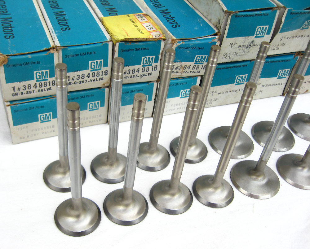 (16) NOS GM set of engine valves. Hard to come by complete set of 16 valves. They are the correct GM Special High Performance (8) 1.60" exhaust + (8) 2.02" intake swirl polished valves.