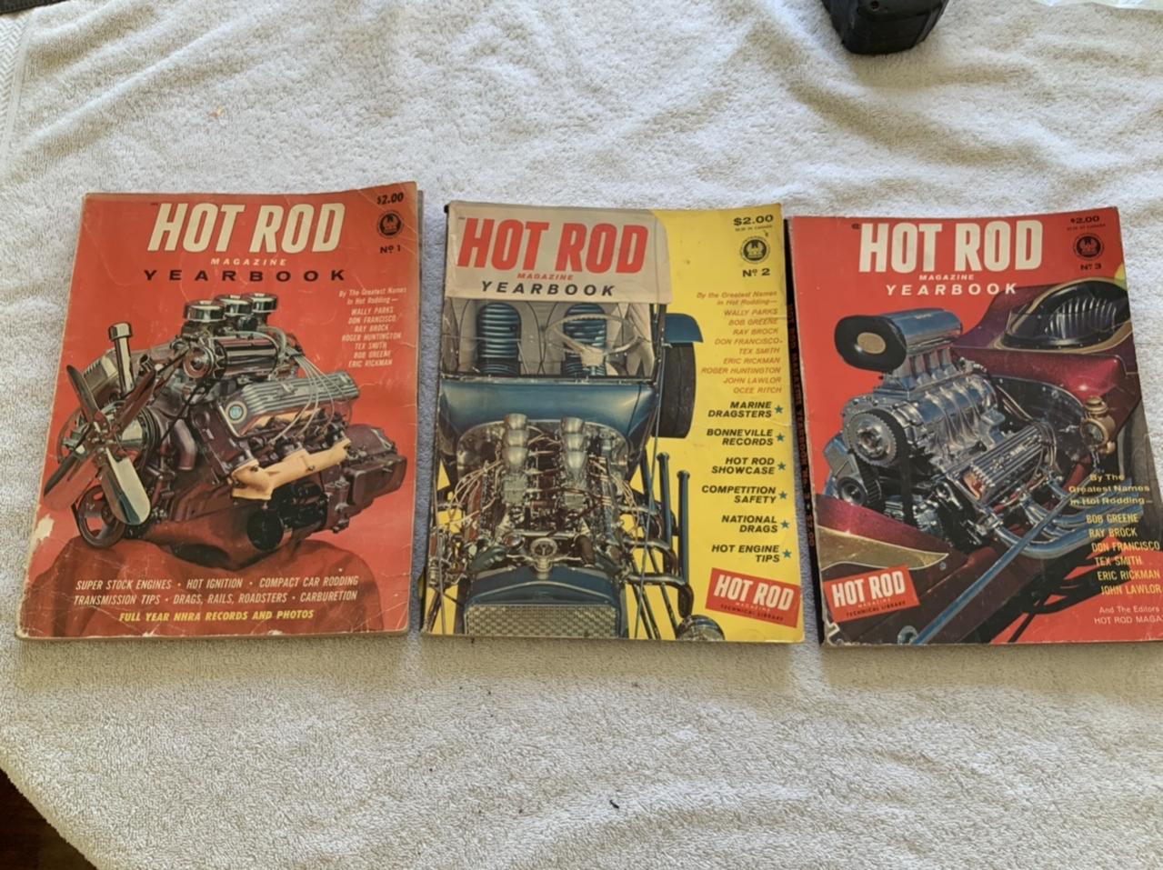 I have a set of hot Rod Magazine year books. They are #1 (1961), #2 (1962), and #3 (1963) they are all in very nice shape. I had the rate them on a scale of 1 to 10, it would be as follows: #1 probably about a 7 it Has a tear about 2 inches long at the binding in the front, the rest of the pages are nice. #2 Probably about an 8. Small tear in the back at the binding about a half inch long. Rest of the pages are very nice. #3 probably about an 8 as well, only because the back of it has what looks like The red outer covering is coming off slightly. Pages are very nice however. These books belong to a mentor of mine, they’ve been in my possession for probably 20 years but he bought them when they were new and he was a drag racer from the 50s. 60s, 70s, all the way into the 80s before he passed away of cancer at a very young age of 60.You could tell he enjoyed these by looking at the Edges, slightly dirty from somebody looking at them but took enough care because they are wrinkled or beat up. $10 Ea. Or $25.For all three plus the ride. If for some reason you think I’m out of line on the prices, please feel free to make me an offer. I will be listing other hot rod books and some early Hemmings Muscle Machines magazine soon. Payment to be made through PayPal via friends and family so that I am not dinged on fees. Shipping will be in a flat rate USPS bubble envelope at $7.50 ea.