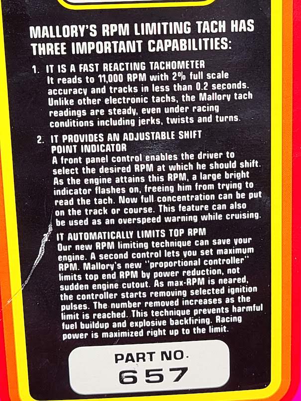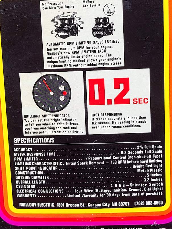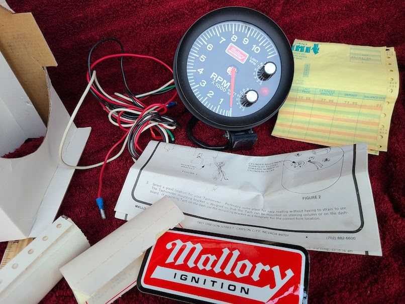 Anyone building an 80's era car? I have the tach for you! This would be a cool choice if you wanted something different. For sale is a Mallory Ignition RPM limiting tach complete with box, instructions, wiring, original sticker, and even original receipt dated 1988! This tach has a built in adjustable shift light and automatically limits rpm via "removing selected ignition pulses". Thank You! Jose tags:tach, tachometer, rpm, gauge, gage Last edited by jbtech; 08-17-2020 at 05:55 PM. |