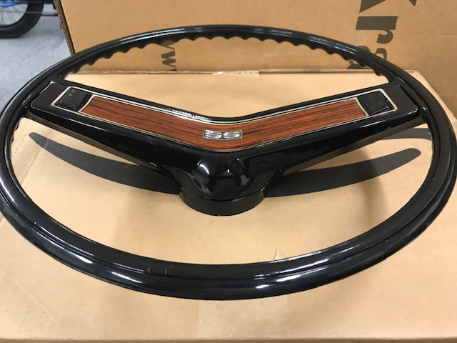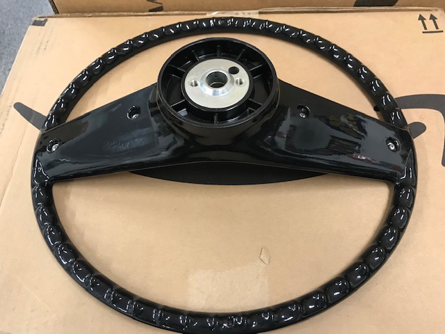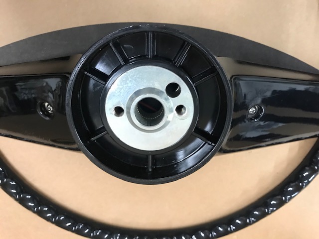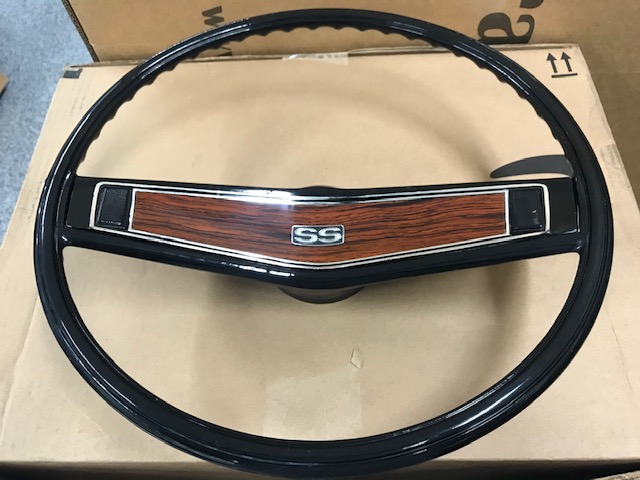 1969 Camaro black steering wheel with shroud and horn wires inside.
