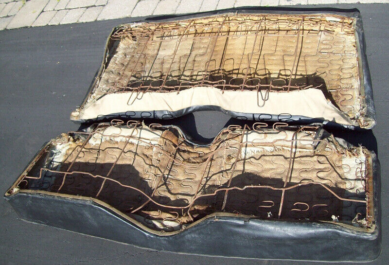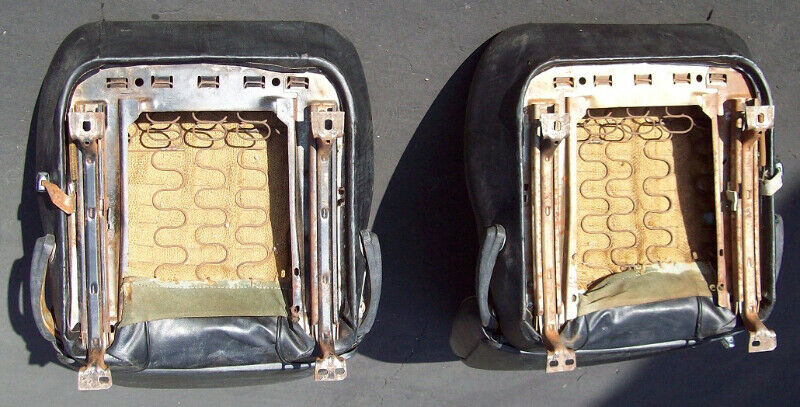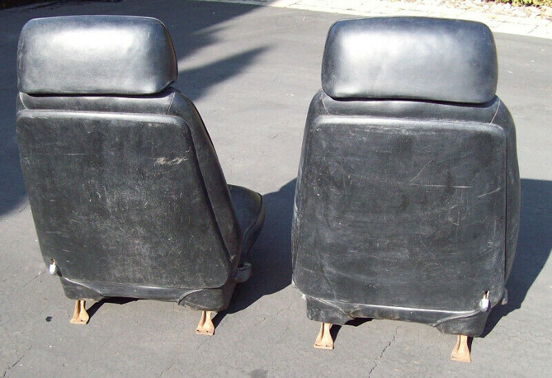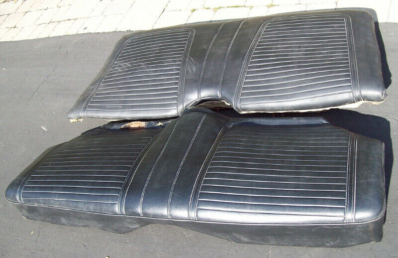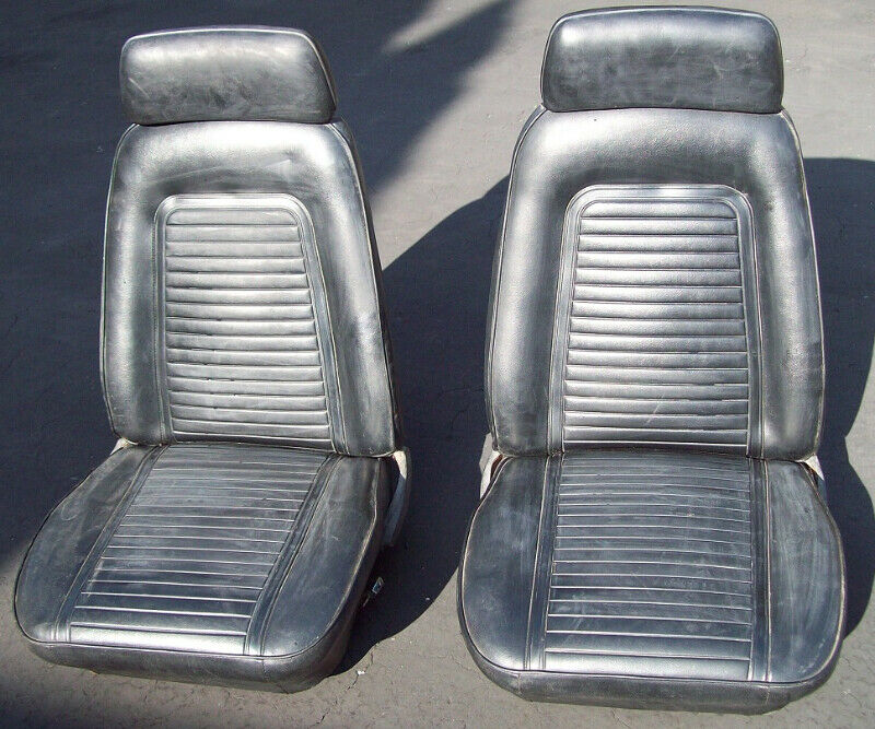 Complete set of original GM Seats, Front Bucket seats and rear seats. Never restored. Head rests have NO cracks, Upper rear seat no cracks, Lower Rear seat has a hole on the back edge, Bucket seats one has NO tears and the other one has a corner tear which is very hard to see under the upper seat but on the bottom away from the center insert. The bottom Tracks are near mint shape and operate smoothly. Back panels have NO cracks but can use a light coating of SEM black dye to cover all the surface scratches.