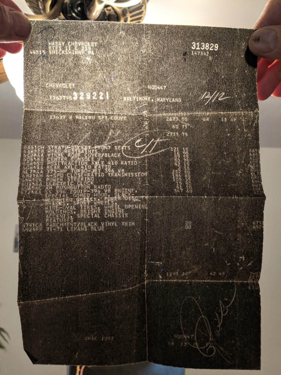 My dad ordered one when he was 21 in November of 68.. He had it delivered on Dec 18, 1968 ...Unfortunately, like most people he had to sell in it 1972 due to his upcoming marriage to my mom and needed money...Since I was a little kid he was always telling me stories about that car , street racing it against his buddies in other cars, taking it to the track etc etc... Those stories always stuck with me and I always wanted to get back his car and give it to him. He is 73 now and I'd like to find something similar as he had and give it to him so he can drive it again, while he still can. Ive tried desperately to find his actual Chevelle, but every avenue is a dead end.. Since I have the VIN ,I got information from the DMV but all that came back was an old encumbrance from 1983 and the gentleman doesnt live at that address anymore, and i cant seem to find a valid phone number. He still has the carbon copy of the sales sheet stashed away with leftover parts he had from the car that he is still keeping. This is how he ordered it... and what Im trying to duplicate A51 - strato bucket seats A82 - head restraints C08 - Vinyl roof cover/Black D55- Center console G80- posi traction G84 - 4.10 rear axle L78 - 375Hp 396 M21- 4 speed close ratio N40 - power steeering U35- Electric clock U80- AM push button radio Z25- SS 396 package 791- Parchment / black vinyl trim 924- 71-71 Lemans Blue |