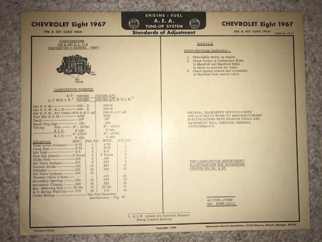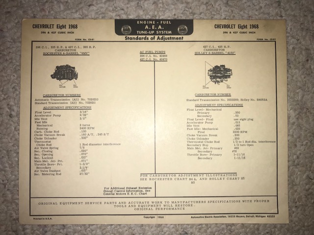 Complete 1967 and 1968 tune up cards (total of 4) for Camaro, Chevelle and Chevy II (4 total) which include 302, 350, 396 and 427.........$50 Complete tune up cards (total of 6) for the following models 1500, 2100, 2400 US and 1000 and 1200 Canada.......$30 Complete 1962 tune up cards (total of 2) for Biscayne, Impala, Chevy II and Nova which include 283, 327 and 409.........$20 Complete 1962 and 1964 tune up cards (total of 2) for Corvette which include 327 for the 365/375 HP.........$30 Complete 1956 and 1957 tune up cards (total of 2) for Thunderbird......$10 Buy all of them......$90 Paul |