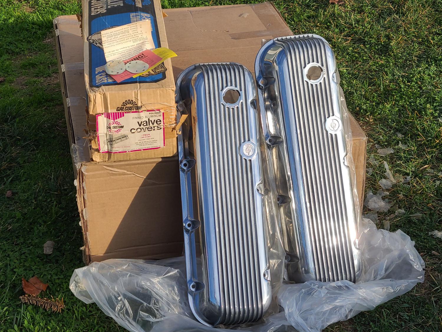 These are a new old stock set of Cal Custom Polished Aluminum Finned Valve covers for Big Block Chevrolet. These retain their original plastic covers, box, instructions, and everything you see in the photos.