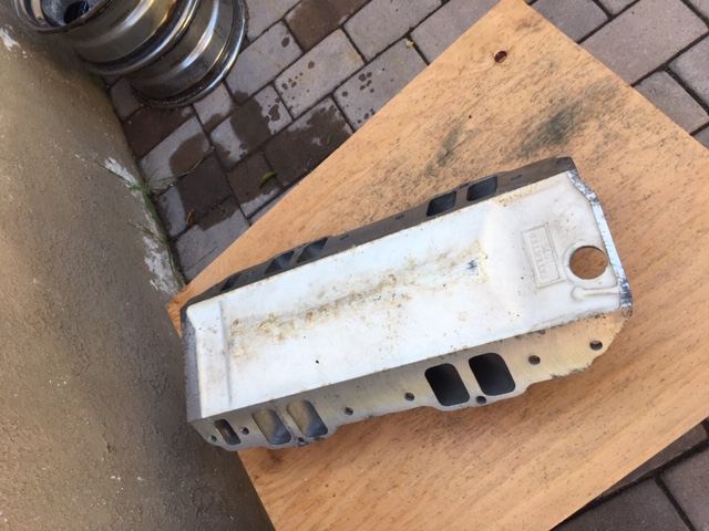 For BB chevy, square port. This piece is NOS, never been mounted, included the studs and gasket that came in the box. Box was destroyed, it got wet at one time, so slight discoloration especially in the valley, I sprayed some PB blasted on it to prevent any further oxidation. Its still in very nice condition, the oxidation was just cosmetic. Cool old piece $275 + ride.
