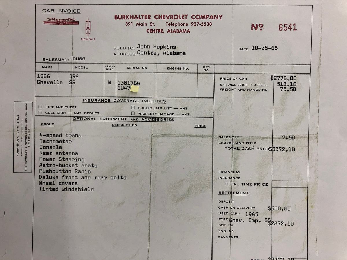 John Hopkins, a cotton farmer from Centre Alabama, took delivery of this 1966 Chevelle SS396 from Burkhalter Chevrolet Company in Centre on October 28th, 1965. Because of the nature of his work it was never used as daily transportation. Conversation with John plus maps and brochures in the glove box revealed that numerous trips were made to Florida's Gulf coast.