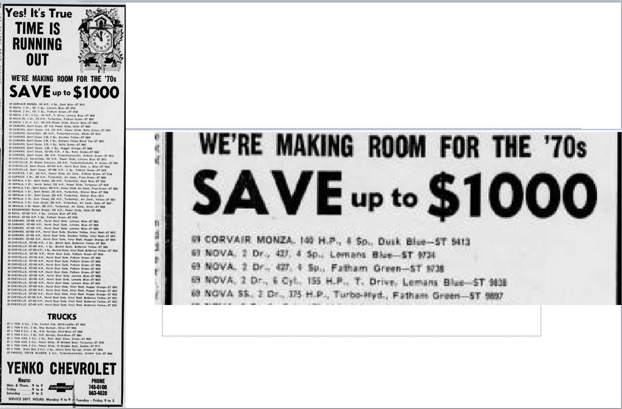 I assembled a reference page of 25 items found online including; pictures of 8 to 10 known cars that are said to be 427 Yenko Novas old pictures of cars that are known and of some cars that have not been found old newspaper ads old Dealer ads a Yenko 427 Nova window sticker. I read that 3 cars were sold by Colonial Chevrolet This is not an accurate list since there may be some duplication where the same car can be listed in multiple ads or pictures. Not included are claims of at least one 427 Nova sold by each of several large Yenko Super Car Dealers Maybe others can add or subtract from this group? |