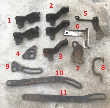 1-7 & 9 - miscellaneous brackets, $5 each or 3 for $10 8 - hard to find SB AC bracket, $40 10 - alternator bracket, $5 11 - 67 BB smog adjuster brace, $20 Thanks, Martin