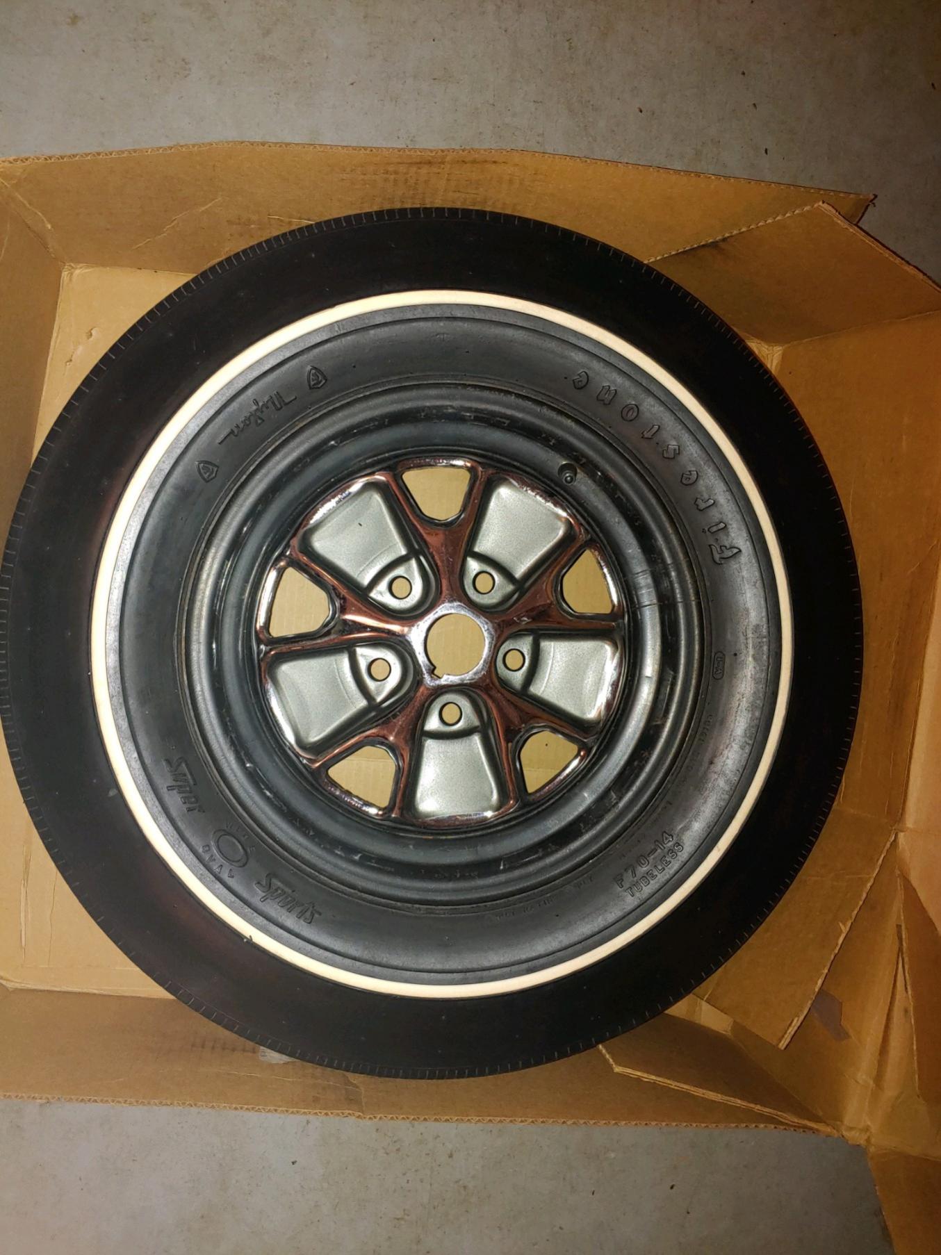 I need one more real 1967 Firestone Wide Oval F70-14 white-stripe tire. These are the version that have the writing in close to the wheel, and the stripe out close to the pavement. A pic of two of them is attached. These are not reproduced. The repro has the stripe close to the wheel and the writing outboard of the sidewall center (I believe that was the 1969+ version).
