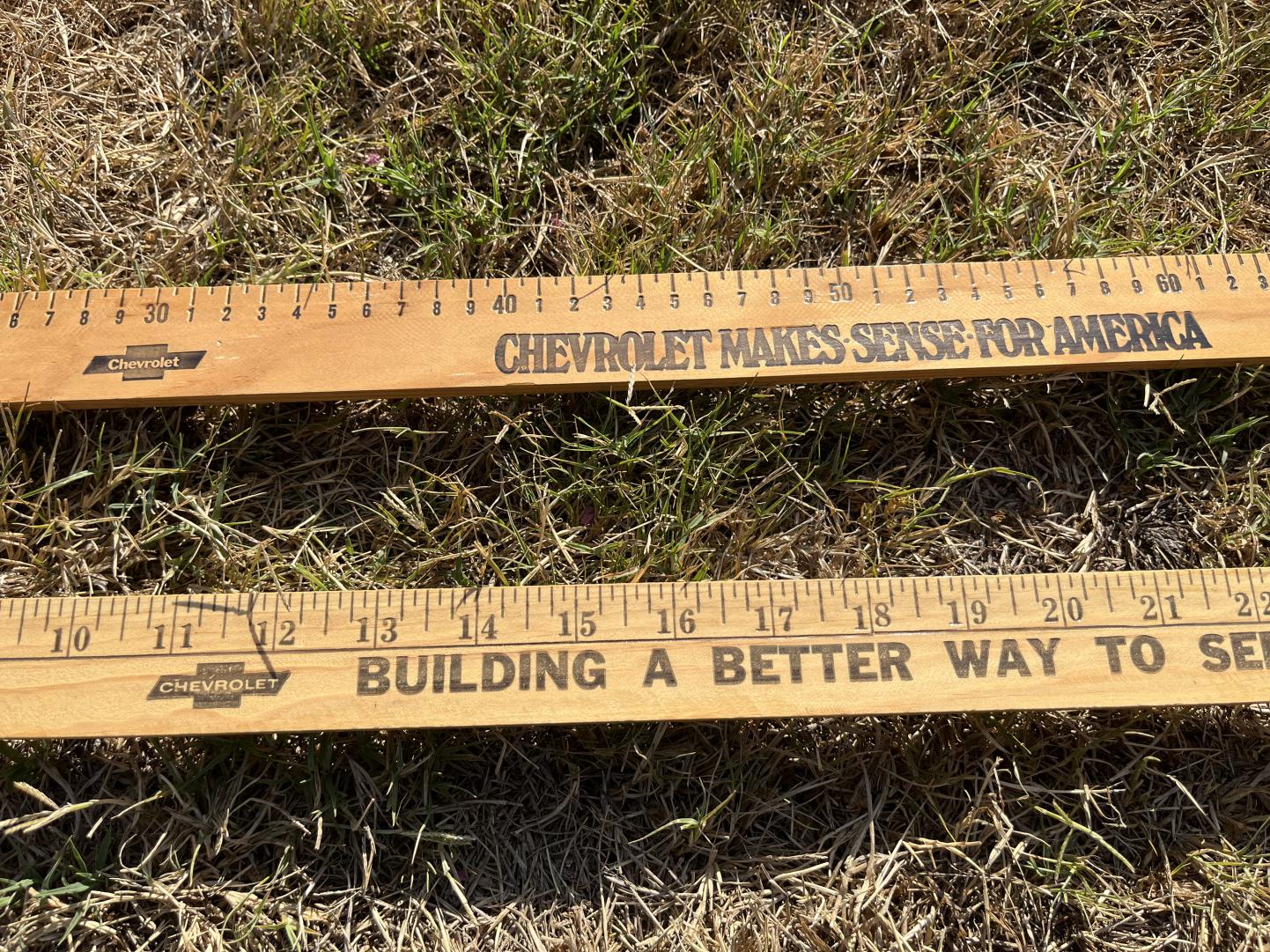 Here's a pair of Fletcher Jones Chevy Chevrolet Dealer advertising pieces, two wood / wooden yardsticks yard sticks. Very cool pieces of memorabilia IMHO. They've obviously always been local and I can't say the last time I've ever seen or heard about one. These are NOS - or were when I got them; they are still unused and have the classic sheen to them and are clearly genuine and have some age to them that cannot be faked - certainly not reproductions for sure. They've been a wall hangers for years and years. One shows both inches and centimeters. I'm not sure what year(s) they're from but the back of one is a metric meter stick, so that might shed some light - when were they pushing that down here? Mid 70s? Also one's showing a Westminster address and the other is in Whittier, that might help to date them too. Anyway, they are what they are and I'll reluctantly sell for $150 each PPG shipped to the 48 with insurance. I have looked for years for their license plate frames from either of these cities and have never found one of them... and these are the only rulers I've ever seen / had. Very cool opportunity here and they doesn't take up a lot of real estate. Cheers all, Anthony ps - yes, that's what our backyard lawn looks like now... - and this was long before Jr. started slinging Mercedes automobiles in Newport Beach at Jamboree and the 73 - those commercials are ubiquitous around here... almost as much as ze cars themselves. |