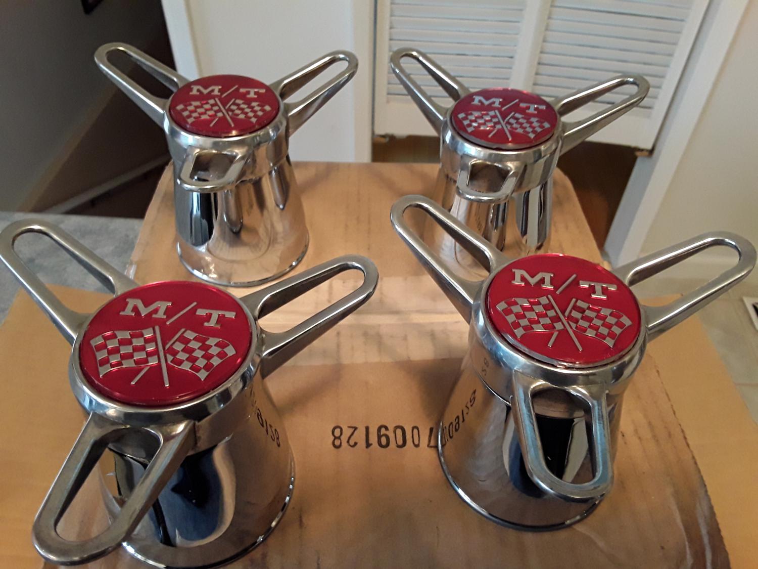 Full set of circa 1965 M/T spinners.The spinners are in perfect shape and the mounting cones were recently chromed.All threads are good.The red center emblems are very rare.There is an extra spinner included and that is what they all look like under the red emblems.The extra one's mounting bolt is half broken off.You can text me at 613-866-1964,PM me or email [email protected]. Asking $900.00 shipping included.Will be sent first class,insured and with a tracking number.Paypal F&F preferred.Thanks,Bill.