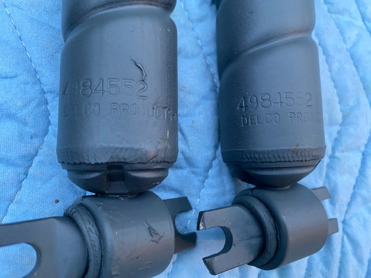Set of four shocks that I purchased here a few years back but decided to stick with Day 2 for all my Camaros. These are obviously not all date correct but I was told they were (and they appear to be) a bolt-on for 68-69 Camaros (and were removed from a ‘68 show car). I’d like $150 plus the ride which I think is what I paid for them. All have some resistance moving up and down but it’s inconsistent, so I’m selling these as showcar parts and I’m recommending no one drives with them unless they are rebuilt. See pics below-