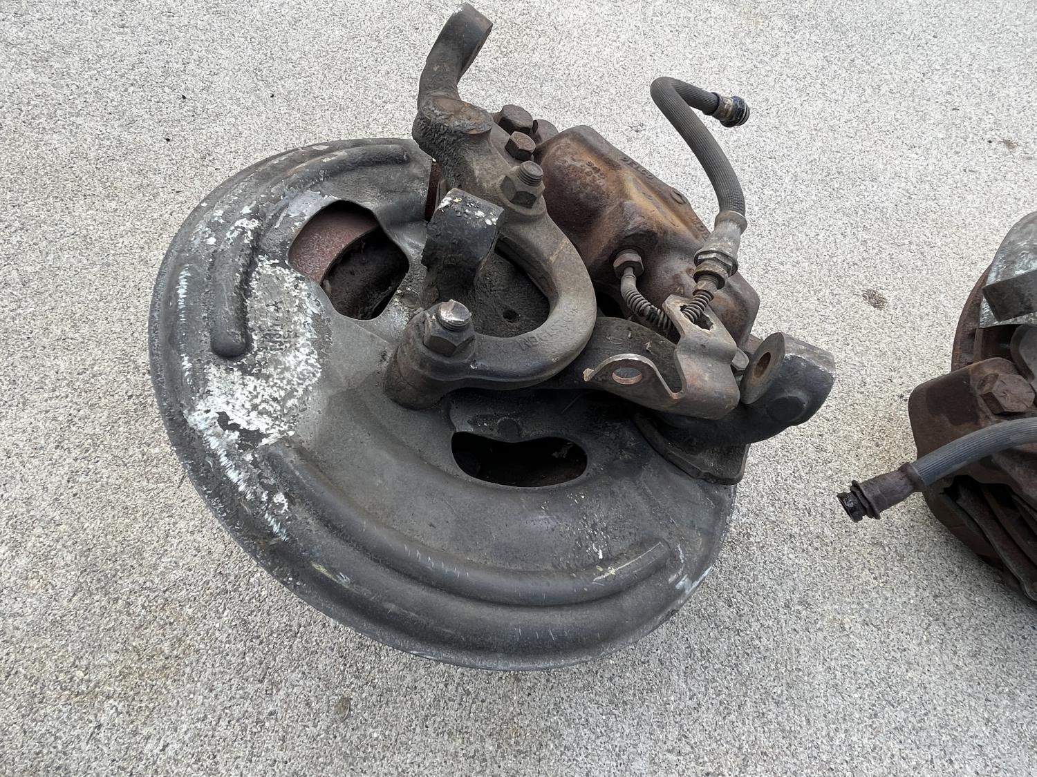 Even the original single crimp hoses are present and the line clips as shown (I would not use these lines of course!) - all of this is what leads me to believe this is a genuine original set up... One dust shield is dinked from a light drop and certainly repairable and not fatal.