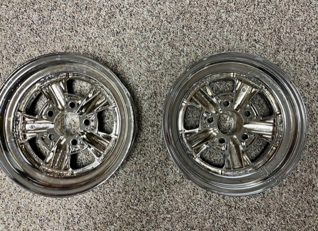 I have a direct bolt pair of 15x4 Cragars (Chevy) that were rechromed by Atlas in Texas and never mounted. They come with the non R caps that were also rechromed and a new set of lug nuts and valve stems. I can send pictures if need be to your phone or get NovaBoy Dave to put them on the Site for me.