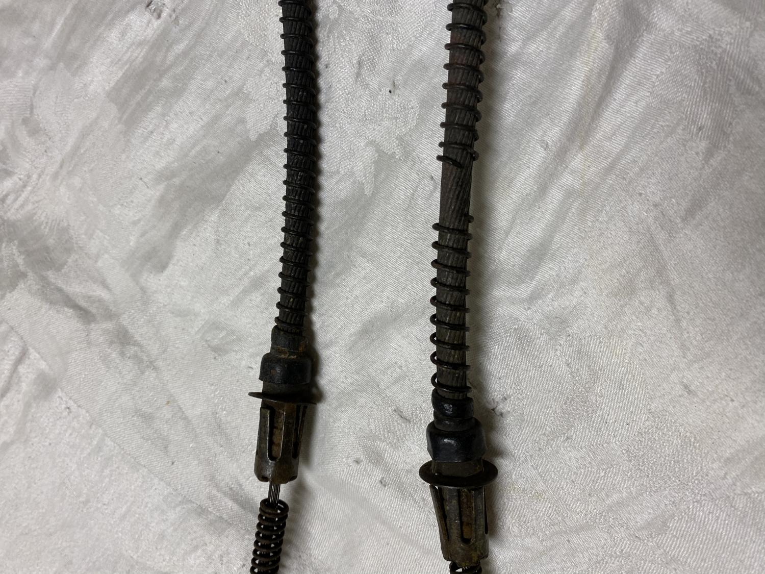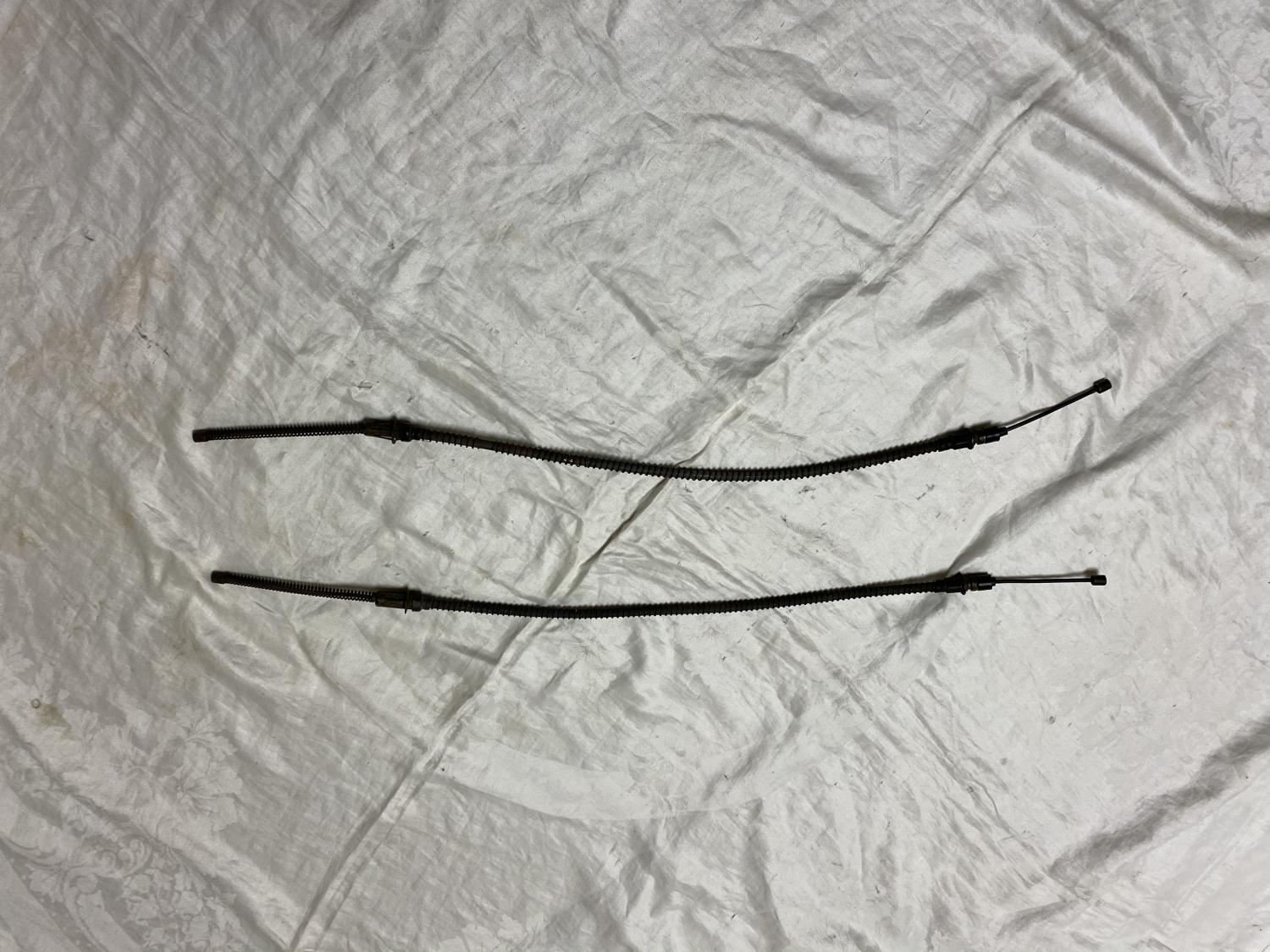 Originals removed from my 04B 67 Z28 over 25 years ago. My research finds they are GM # 3934646 or 3914889. These are 32 1/8” long. My Chevrolet parts catalog says they are 67 second design with metallic brakes HD 302 and 68 with HD brakes with V8. They are in nice condition and move freely. The outside spiral casing on one is separated or broken in one spot. Probably from where the shock plate bracket retains it. The spring ears that clip into the backing plates are perfect. And I installed new Motor City dust boots on the front ends of the cables. I had to trim the rubber on both because they tore when installing them which wasn’t easy. $125.00 includes shipping in the lower 48 states. F and F PayPal please. Jim