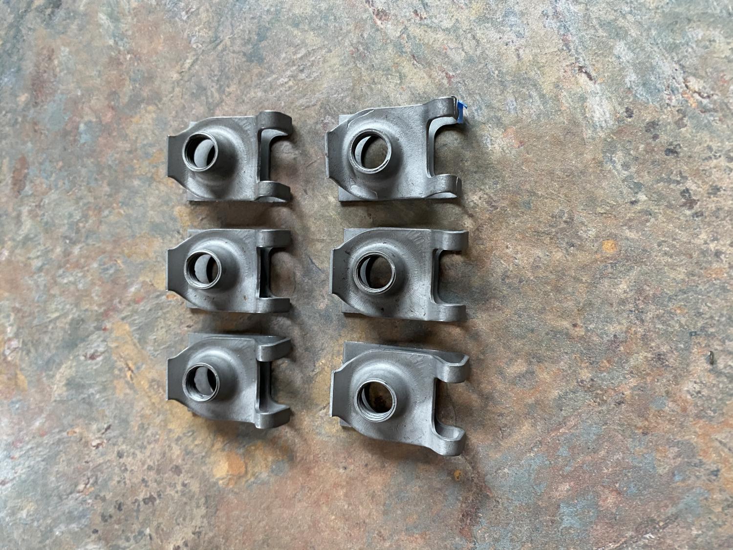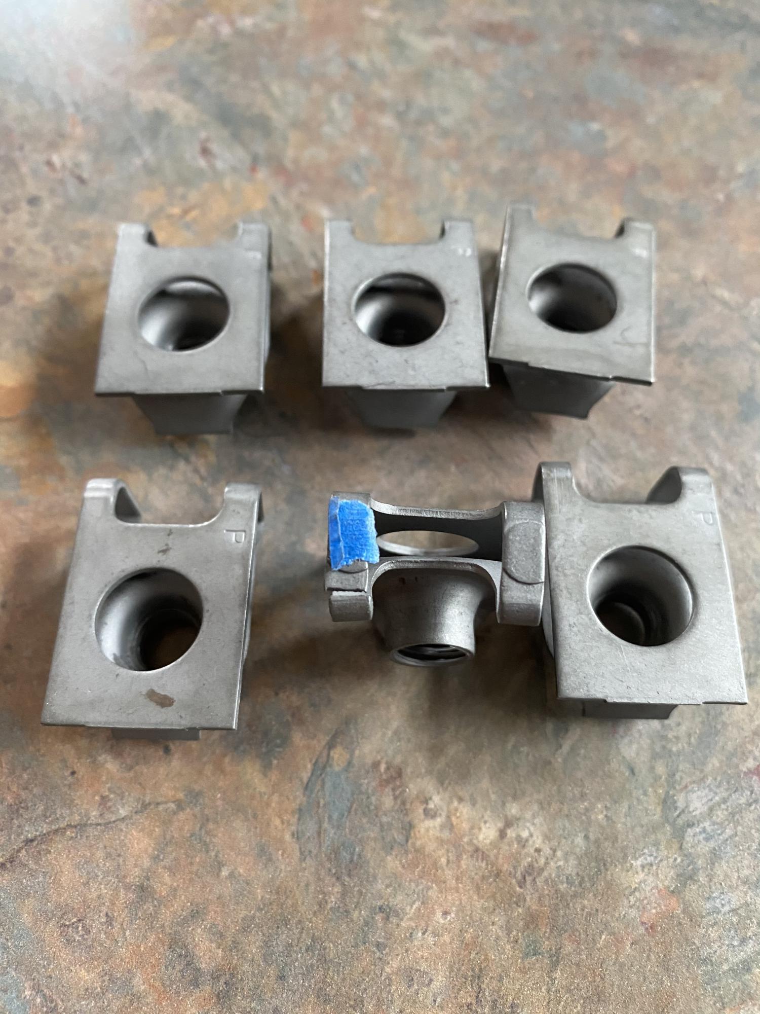 Pulled these off a 68 Camaro 30 years ago. GM #3992755. One has a broken leg as seen in last picture next to blue tape. Had them media blasted and clear coated them to prevent rust. Threads are nice also. These have the letter P stamped on them. $30 includes shipping. F and F PayPal works. Jim