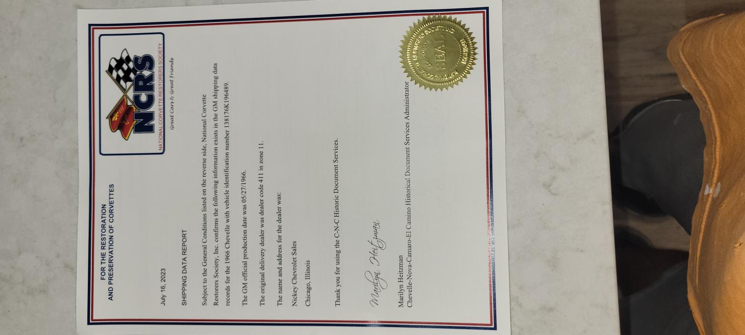 Hi everyone, few years back i went on a less than safe trip to the 87th street area of Chicago.  When hunting for L78 parts i tend throw caution to the wind.  At the time I assumed that i had found a no name short block 66 4 bolt engine.  Upon further review this block still had the partial vin and Towanda stamp on.  I went as far as grabbing the NCRS shipping report only to find because it was from Chicago that the car was indeed from Nickey Chevrolet sold new in 1966 some time after 5/27/66 when the car was produced.  Quite the longshot but if anyone knows the whereabouts of this car please reach out.  Thanks!