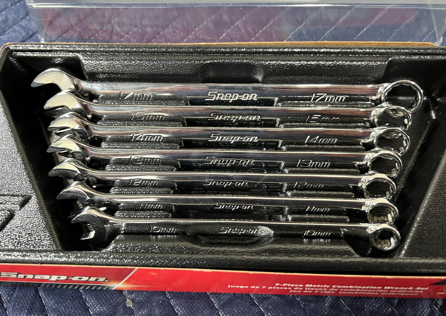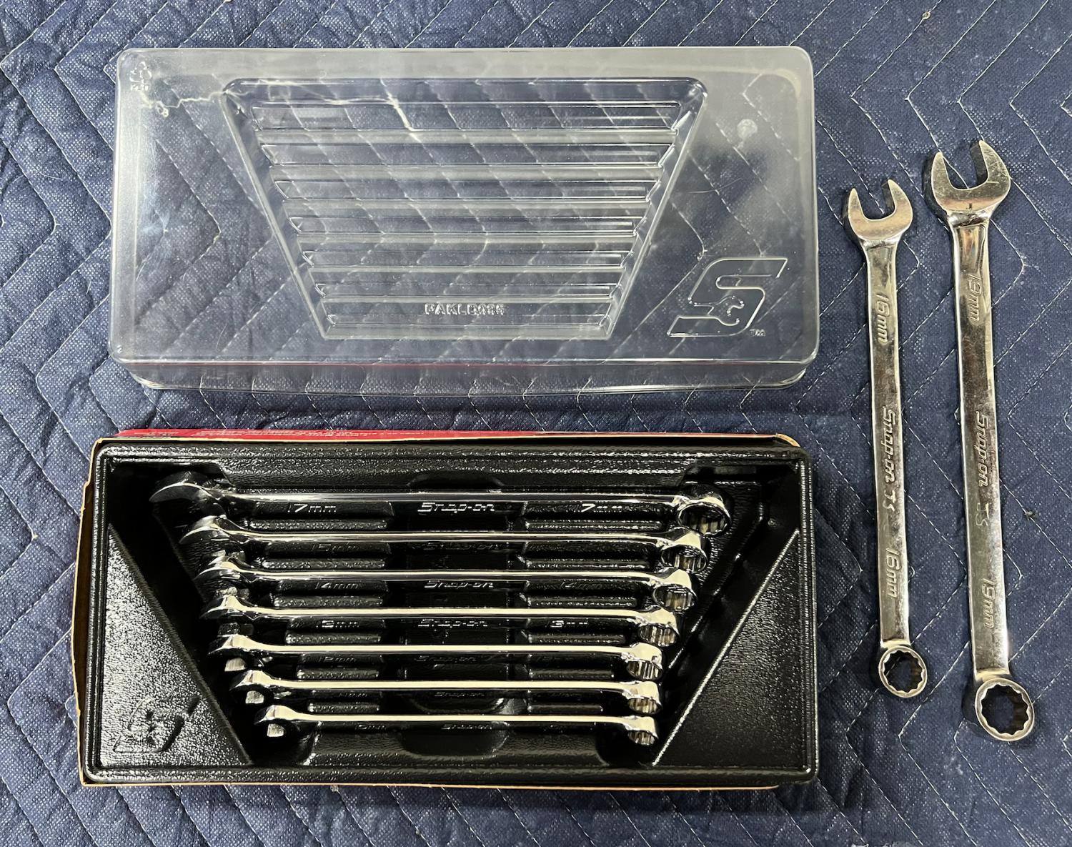 For sale here is a Snap On 7 pc 12-Point Metric Flank Drive® Combination Wrench Set (10–15 and 17 mm). Opened but unused. Mint condition. Comes with all packaging. I'll include a used 16mm and 19mm to help.