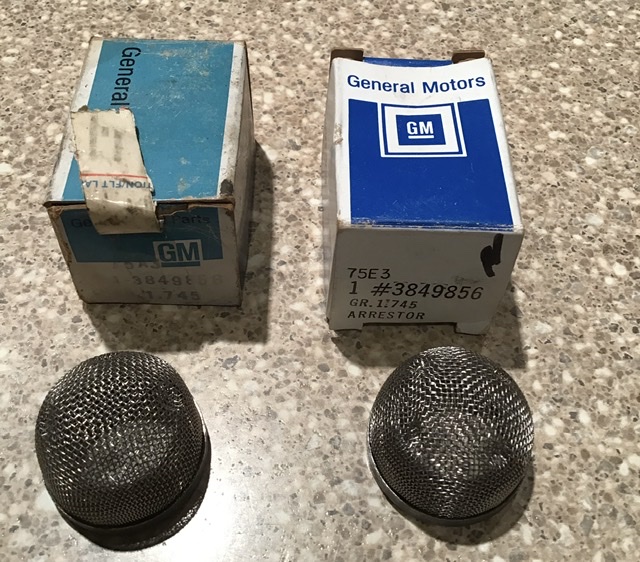 I have two GM NOS air cleaner flame arrestors. Part number 3849856. These fit various years- models. One is marked GM on the arrestor and the other is later make and is not but is GM. Both are in boxes. $60.00 plus shipping.