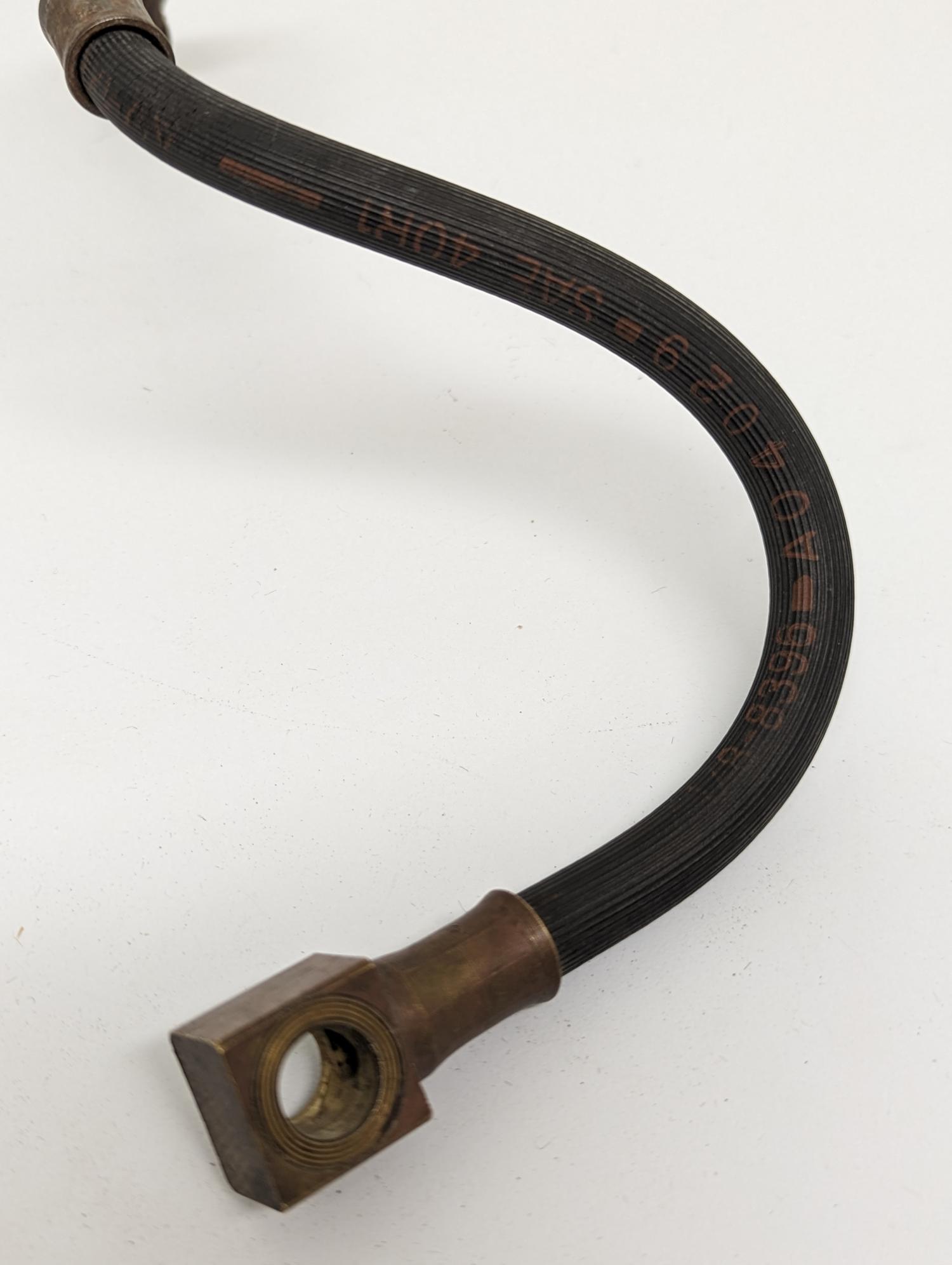 The two front hoses came off of a 29,XXX mile wrecked COPO I recently restored. There is a small split up toward where the brake line connects. On one hose it goes about halfway around the diameter of the hose and on the other hose it has barely started. One hose has A04029 printed on it, the other has what appears to be A16019 printed on it. The red printing and striping isn't perfect but very legible for the most part