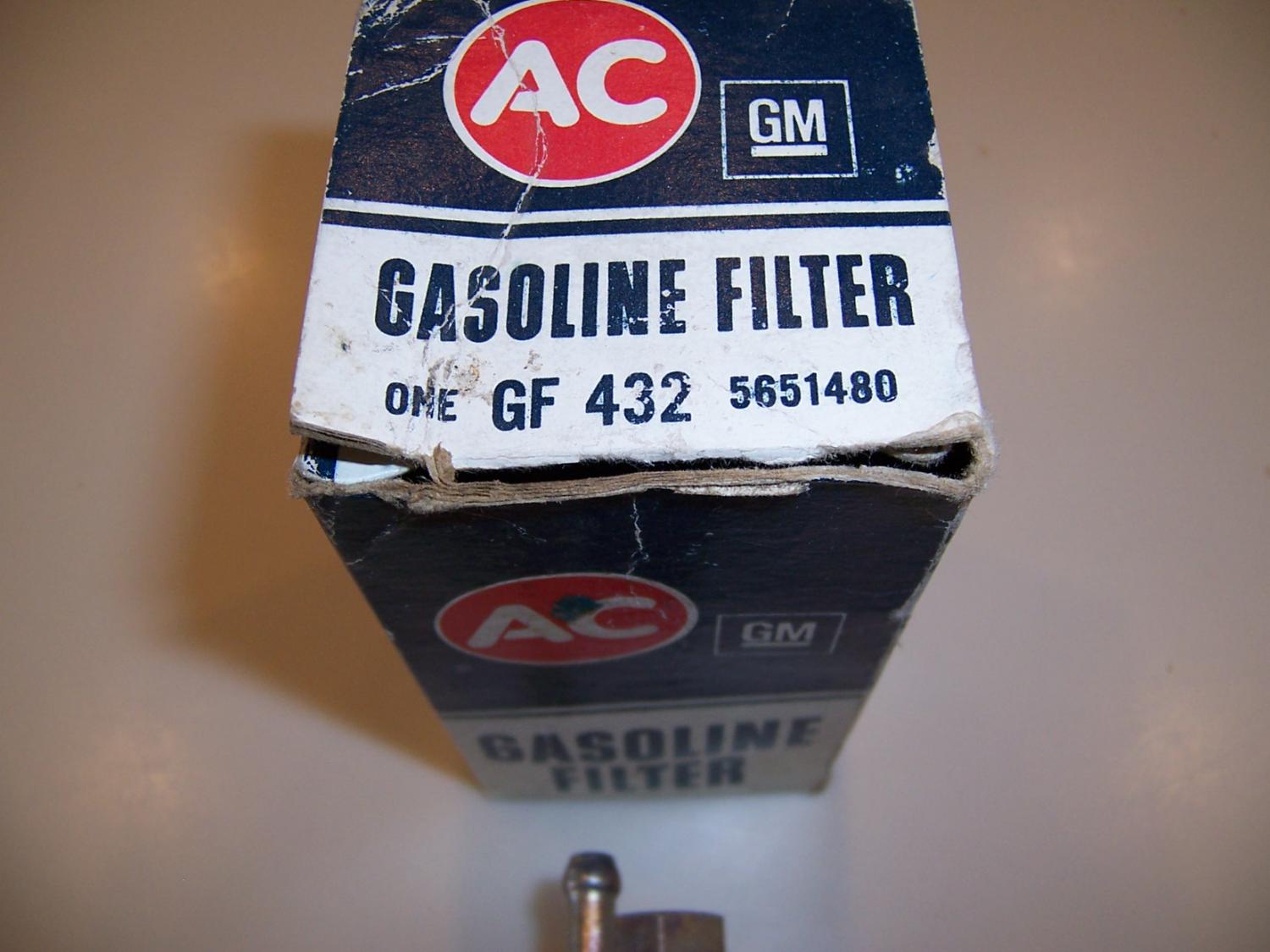 I currently have on eBay one NOS AC/GM GF432 fuel filter, p/n 5651480, still in its original box. This mounts in the fuel line on the front of the engine in various 1969 to 1972 Chevrolet models, big block or small block. In addition to the fuel in and fuel out ports, it has a smaller port on the top side for a fuel vapor return line. I do not know all the different models and years that this may fit, but if you need one, you will know. I had it as a spare for the 1969 Chevelle SS396 that I used to own, but I know that it was also used on the 1971 Chevy Monte Carlo 350 that my wife owned many years ago. It is brand new, still in the original factory packaging, and kept in clean, dry storage ever since I have owned it, which is over 20 years now. Perfect for your restored Chevrolet, when only original GM parts will do. This is being offered with a $9.99 minimum bid and NO RESERVE. Auction ends Wednesday night 6/26.