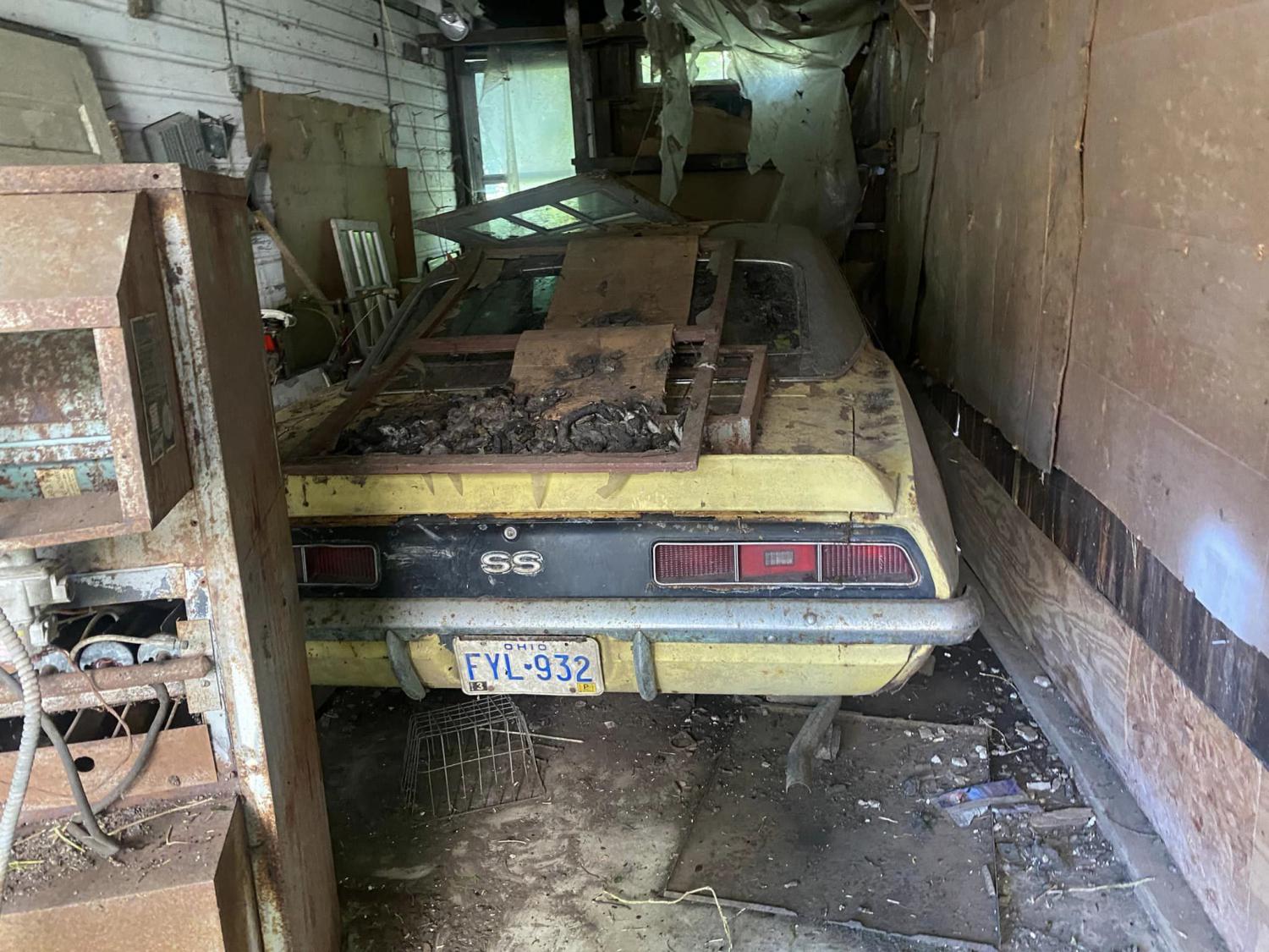 I showed up yesterday and saw a hidden Camaro. Pull the door up and clear a path, and it's a 1969 Rs/ss and reads 17k miles. Her husband parked it in 1982 and left it there.