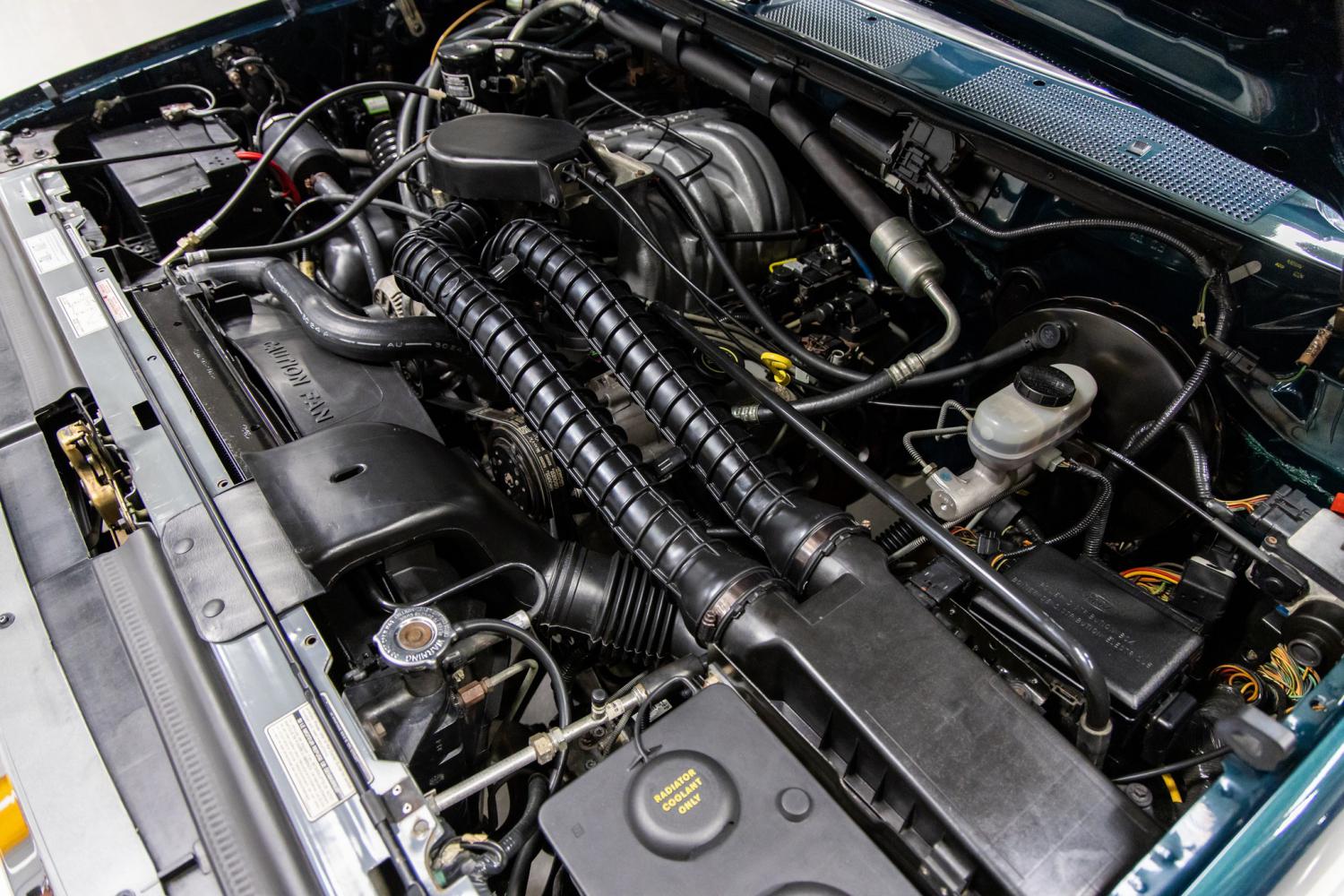 The engine compartment is nicely detailed throughout with no signs of oxidation or deterioration. The body-color painted firewall still retains the original factory assembly stampings. The engine compartment parts retain the original factory stickers and paint marks. This Bronco is powered by the 5.0L EFI V8 engine that was factory rated with 180hp and 270 lb-ft of torque. This engine was recently serviced by MS CLASSIC CARS and runs excellent. The optional super engine cooling system which works well. The engine breathes through the original single exhaust system which is in excellent condition. The engine is coupled to the original 4-speed automatic with overdrive transmission which shifts smoothly. The power is transferred to the original 3.55 conventional rear axle. The rear end still retains the original factory sticker and paint assembly markings. The driveshaft and transfer case also retains the original factory tags, stickers and paint assembly markings.