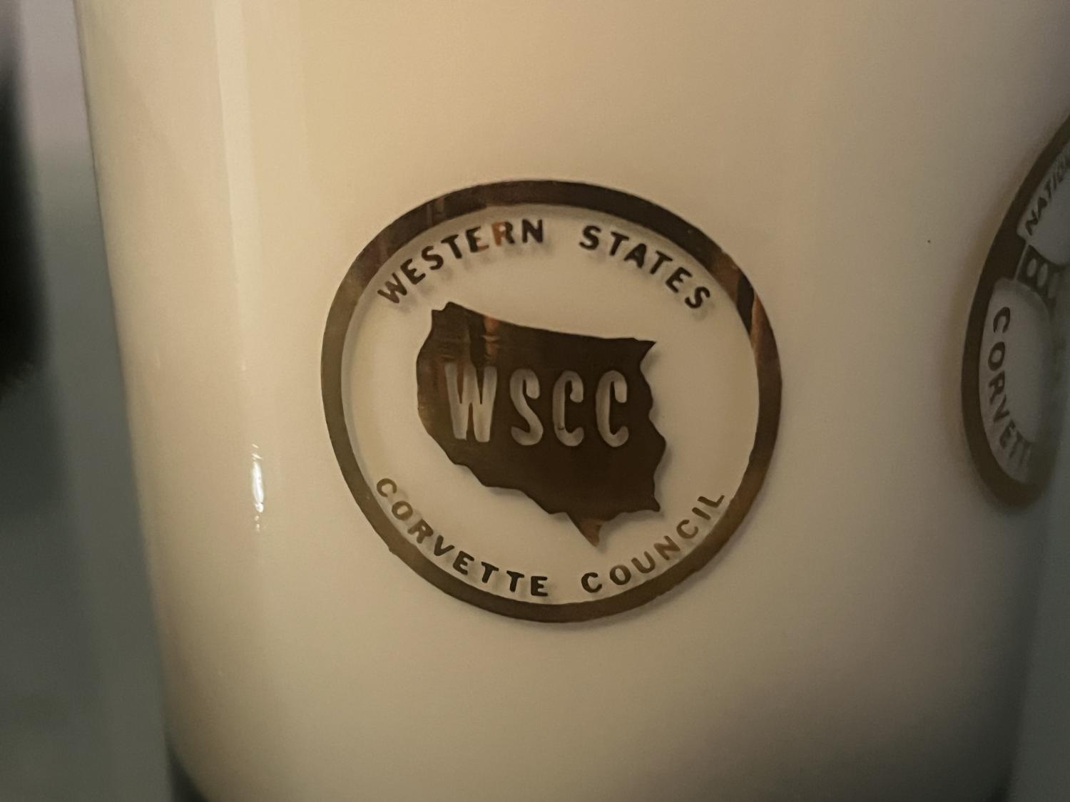 These are very cool and, I was told, were acquired in 1967 by the original purchaser of a 1967 Corvette from Bob Wingate himself when he joined the WSCC (Western States Corvette Council) which was part of the CCC - National Council of Corvette Clubs, Inc. - which is right on the glasses in gilded lettering. The gold pops and still presents very well on these, there is a tiny bit of thinning on the rims, but not so much that it distracts...